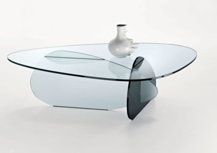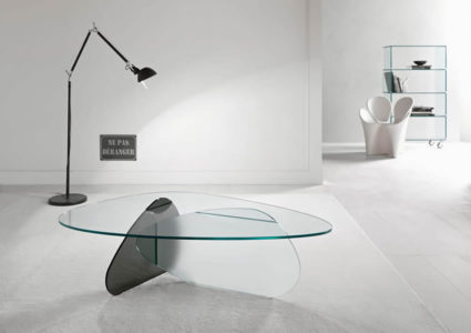 Three glass plates that seem to cross each other form this low table made of three different kinds of glass: smoked, frosted and transparent. Top available in two sizes.