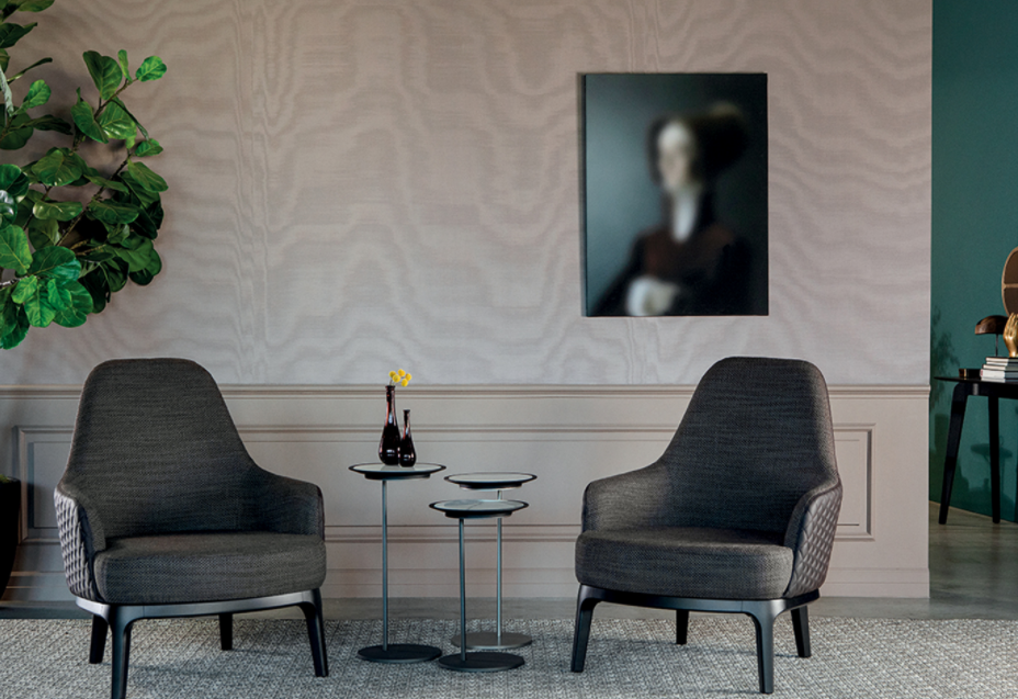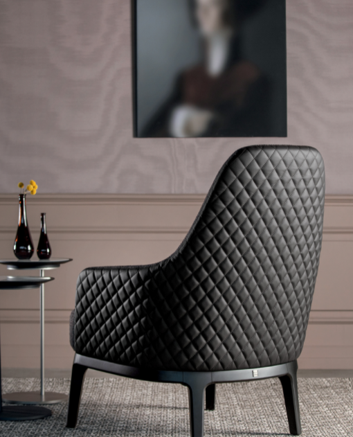 La collezione Cleo si completa con la poltrona disponibile anche in versione pelle abbinata al tessuto, arricchita nella versione élite da un’elegante trapuntatura a rombi sullo schienale.