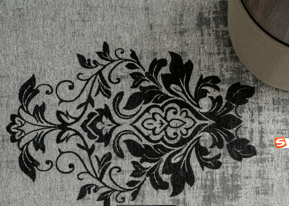 Palmanova è un tappeto a filato industriale, impreziosito da un damasco centrale e da frange. Disponibile in un melange nero e oro, o nero e argento.