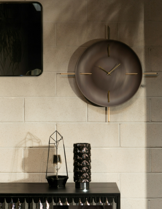 Finitura nero matt intenso e oro in foglio per questo elemento d’arredo dal carattere deciso.