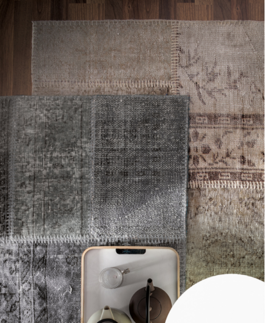Volta è un tappeto filato a mano, con un patchwork originale, disponibile nelle varianti in color grigio Avio e color sabbia.