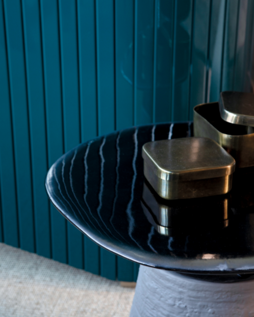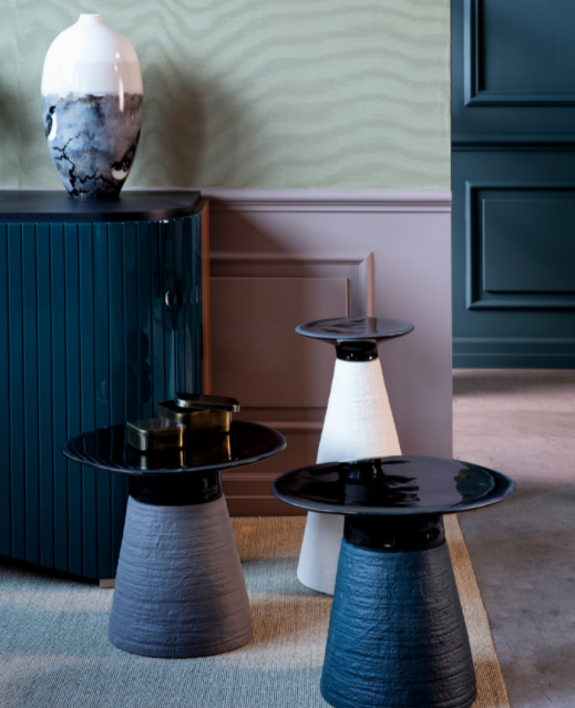 Tavolini interamente realizzati in ceramica, dalla lavorazione artigianale 100% Made in Italy. Due semplici forme, un cerchio e un cono, accostate fra loro, a richiamare quest’albero simbolico, padrone del paesaggio. La solida base che li caratterizza può essere personalizzata in laccato bianco perla, grigio quarzo e blu oceano, con top nero rame perla.