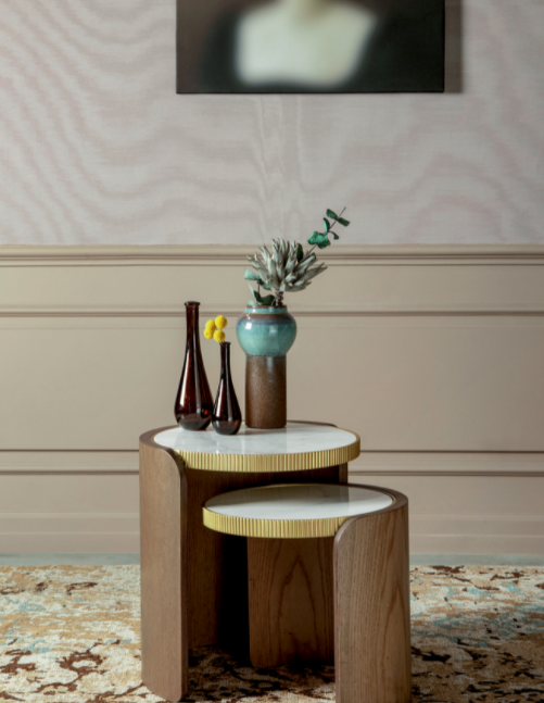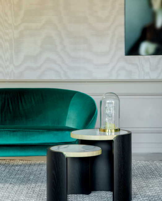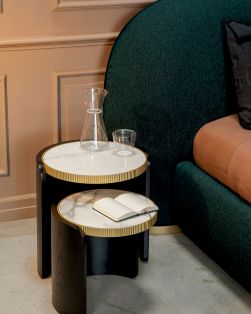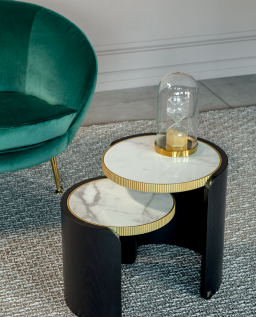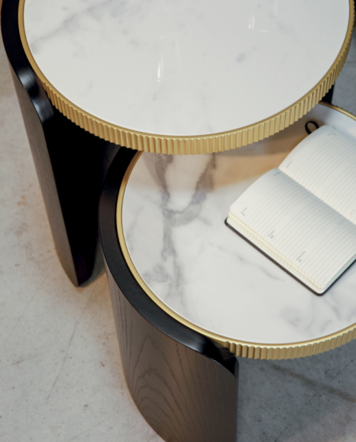I tavolini Roller sono formati da una curvatura del legno e da un piano in gres