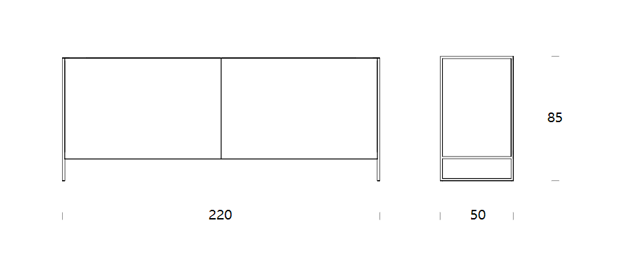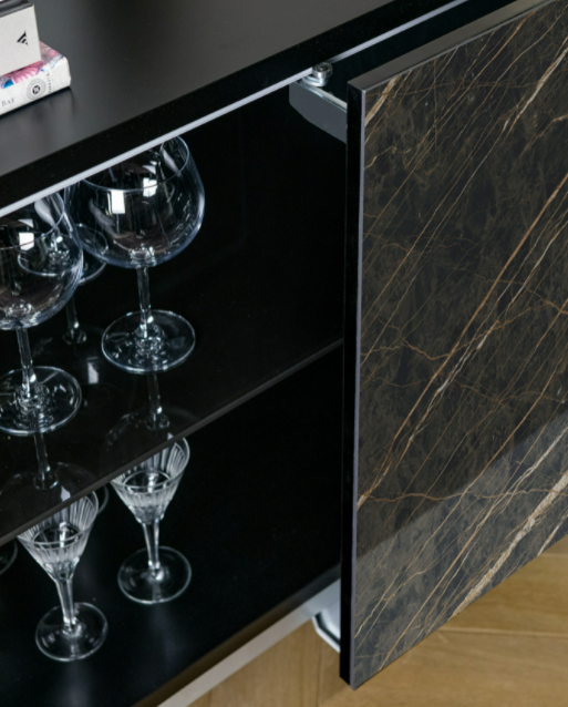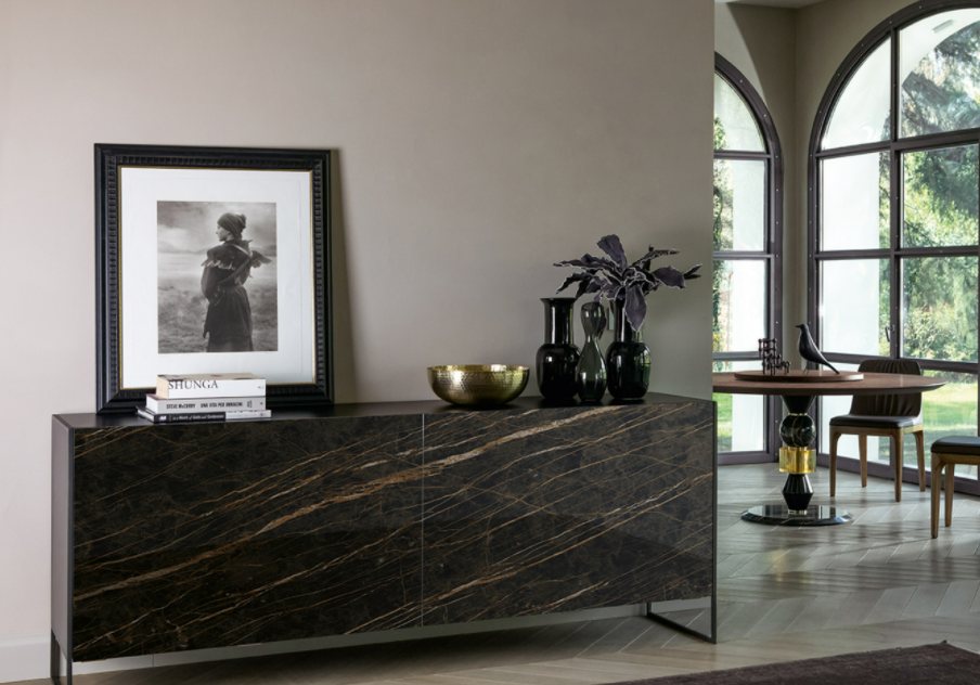 Credenza con ante complanari in gres porcellanato e struttura in metallo laccato. Pensata per essere abbinata ai piani dei tavoli firmati Tonin Casa.