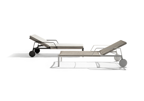 The Nodi lounger combines minimalism with a casual touch. Light and airy, its silhouette is defined by twisted, interlaced rope in weather-resistant Canax?, stretched across a slender, sculptural frame in powdercoated inox. The open weave in Canax?, a combination of PVC and natural hemp, crosses in vertical and horizontal lines, providing shape and structure to the seat and back.