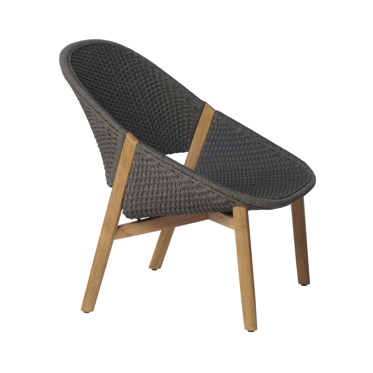 Elio, referring to the Greek sun god Helios and designed by Canadian design firm Yabu Pushelberg, is inspired by the motion of light as it reflects and refracts on landscapes and objects. Multiple soft shades of yarn are woven into one strand, which mimics the hues of natural light and makes each chair unique. The handwoven seat in weather-resistant Tricord rope, draws inward to create a warm, intimate cocoon effect. The easy chair is framed by natural teak, which supports the seating shell primarily through the back legs that cross the shell.