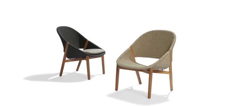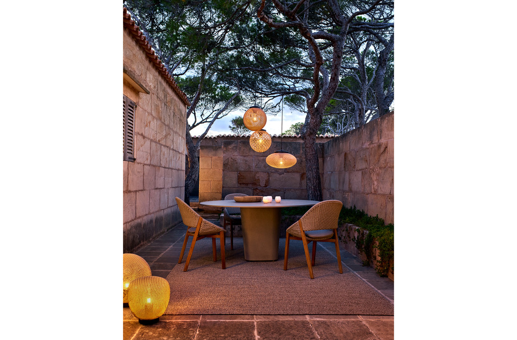 Elio, referring to the Greek sun god Helios and designed by Canadian design firm Yabu Pushelberg, is inspired by the motion of light as it reflects and refracts on landscapes and objects. Multiple soft shades of yarn are woven into one strand, which mimics the hues of natural light and makes each chair unique. The handwoven seat in weather-resistant Tricord rope, draws inward to create a warm, intimate cocoon effect. The chair, perfect for relaxed dining, is framed by natural teak, which supports the seating shell primarily through the back legs that cross the shell.