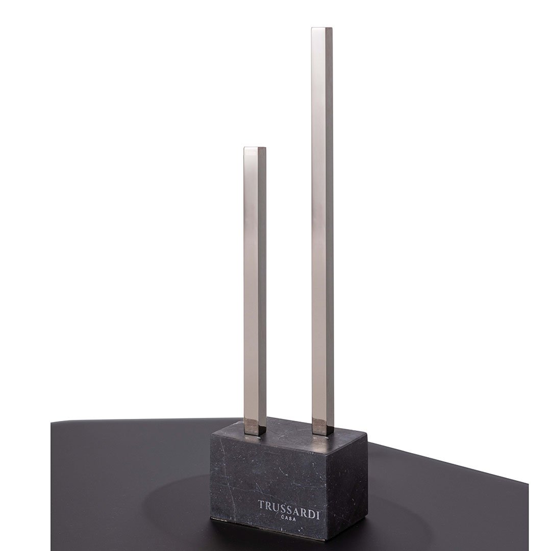 The Block series of lamps stand out for their contemporary style and simple, elegant lines. Base in Marquina Black marble with glazed matt finishing, diffusor with profile in gun-metal grey finishing brass. Suspension lamp with steel ceiling ceiling cap in gun-metal grey finishing and steel cables.
