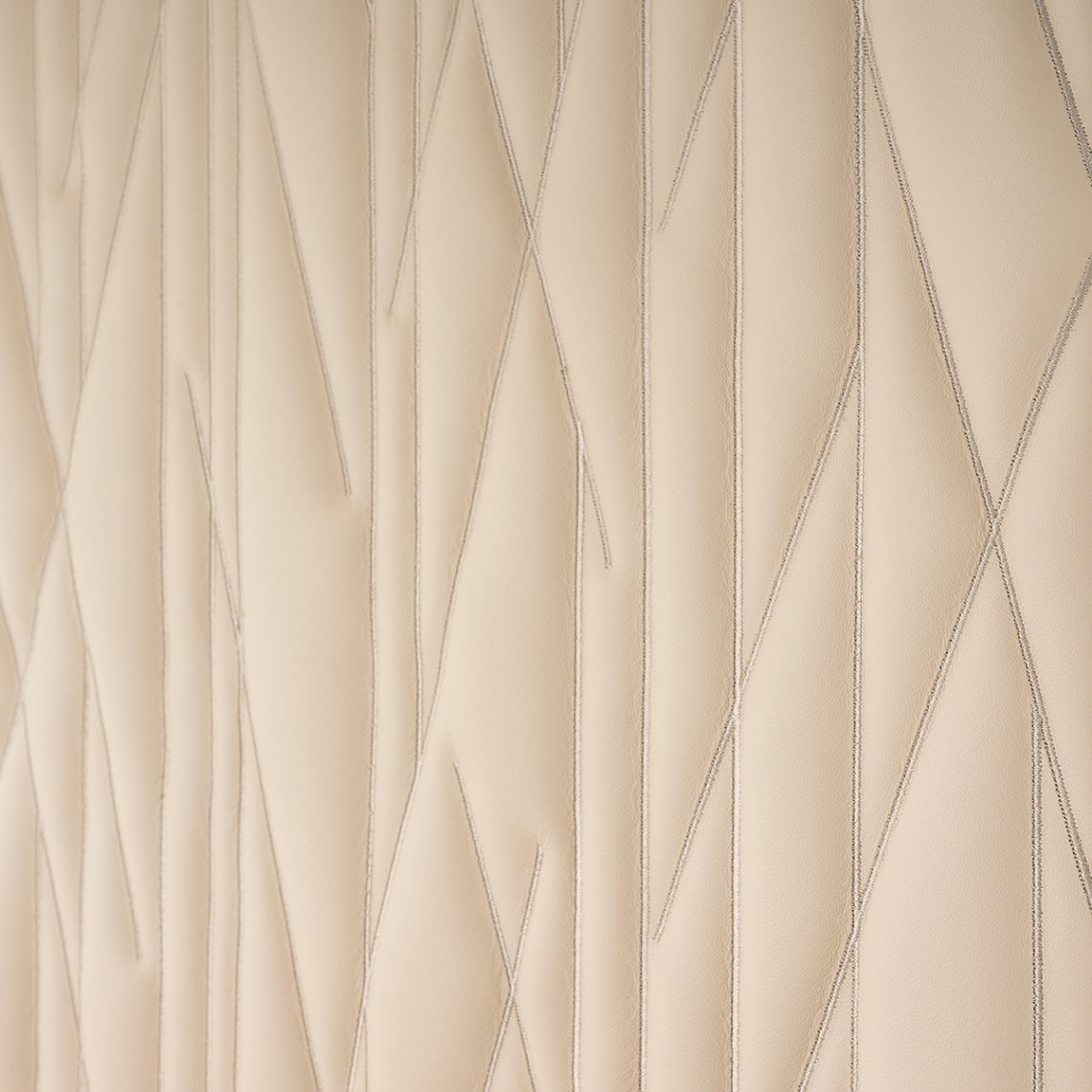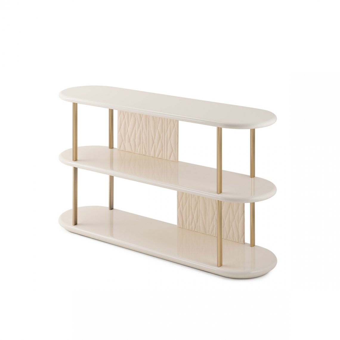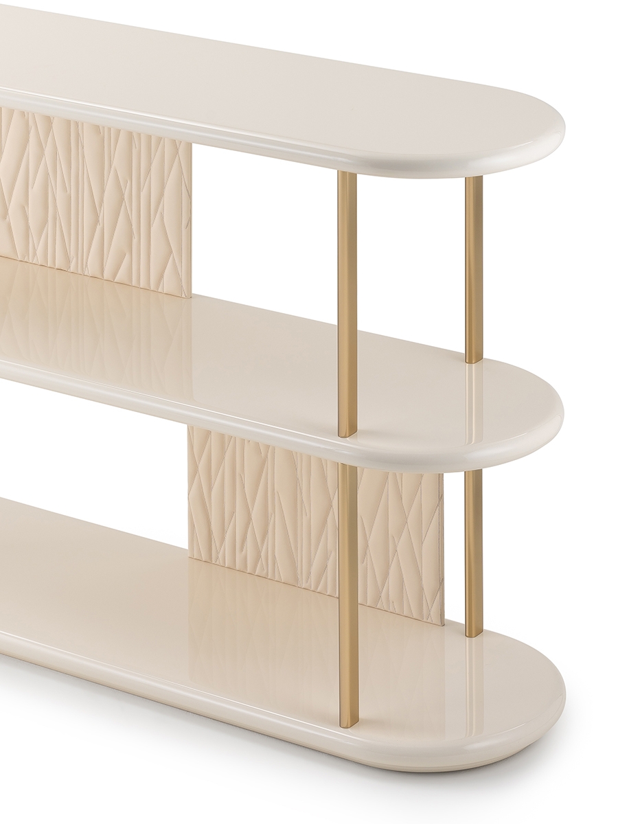 The shelves of the etagere, made of single-color glossy lacquered wood, are vertically interspersed on the back with padded panels that can be lined in leather and embroidered. The vertical metal structure of the etagere is available in two finish variants. The etagere roma Roma is available in different finishes as per sample card.