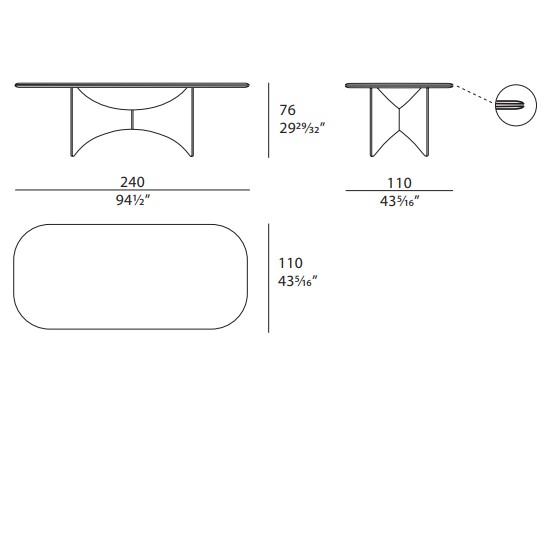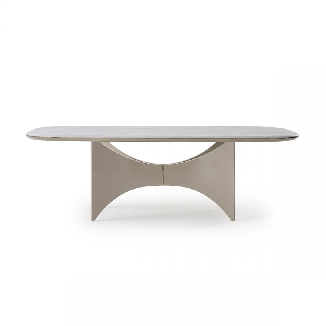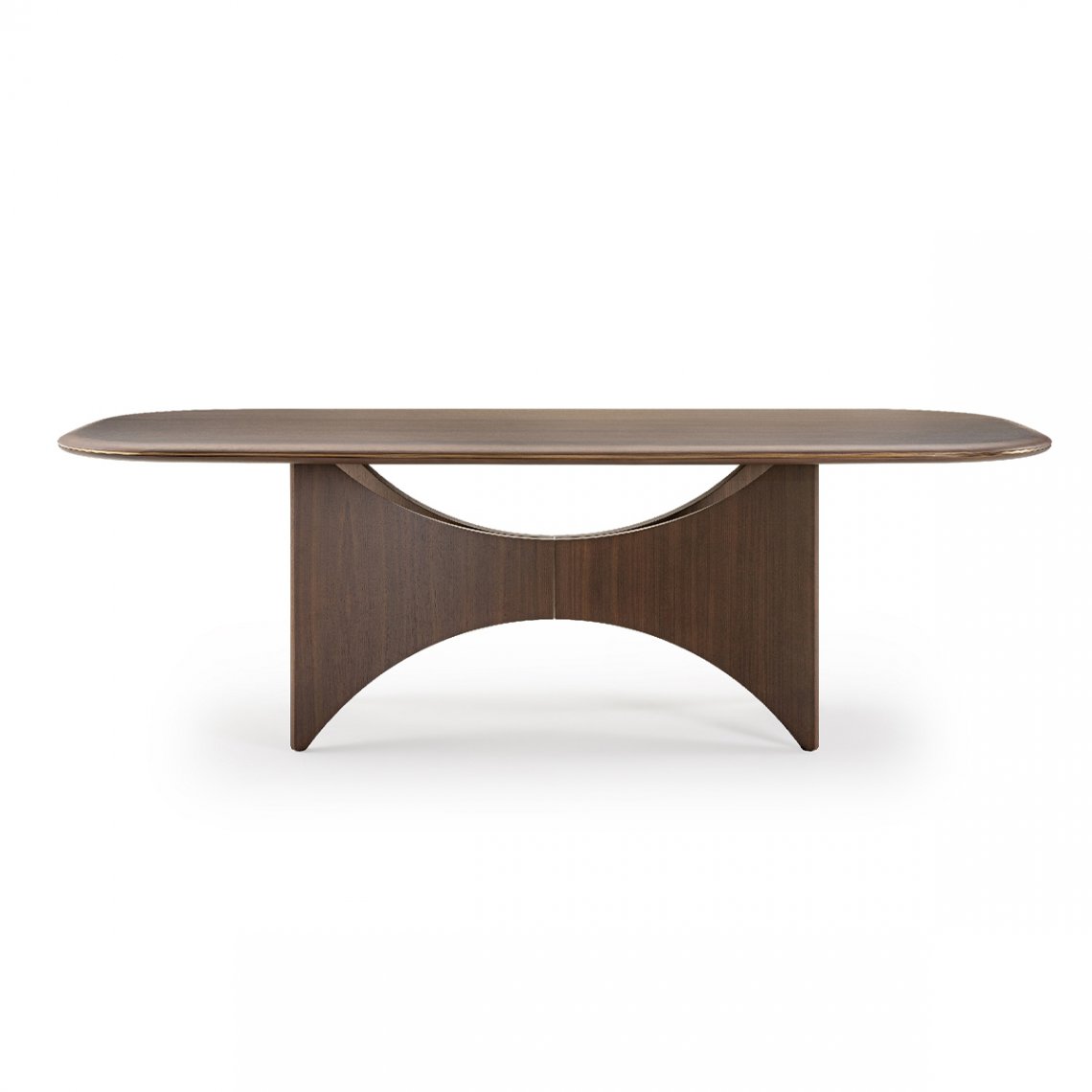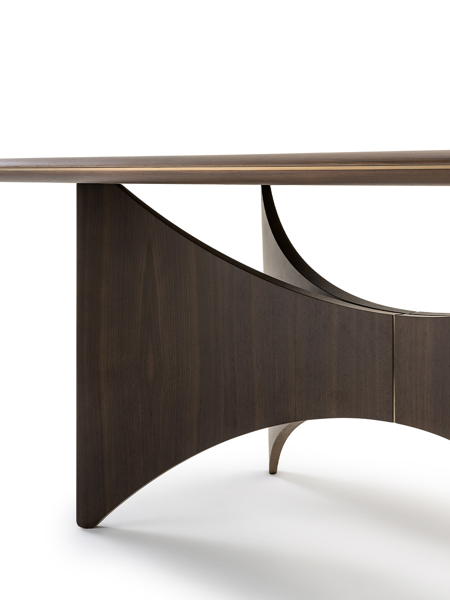 The table of the Blues collection has a base that evokes wings, both aesthetic and functional, supporting the top, in an elegant game of lines. A metal detail makes the central meeting point sophisticated. The top is characterized by rounded corners and circular and light lines, as well as the profile, always rounded and enriched on the entire perimeter with the same metal detail of the base. The different varieties of materials and finishes of the top – in wood or marble – and of the base – in walnut or glossy lacquered wood – make the table a design element suitable for any interior. The Blues table is available in different finishes as per sample card.