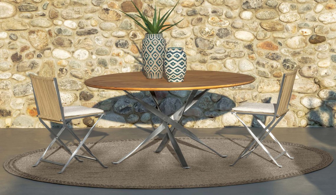 La sedia da pranzo della collezione George combina la struttura in acciaio inox all’intreccio di corde sintetiche che costituiscono lo schienale e la seduta. Grazie ad un gioco di incastri tra le corde la sedia è facilmente richiudibile.