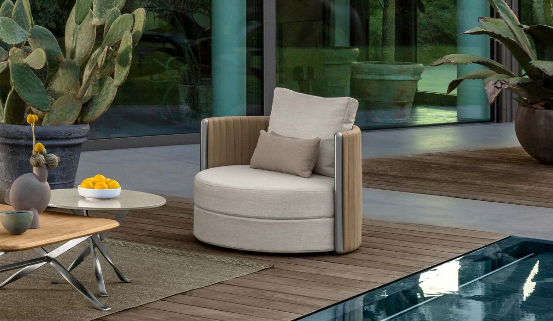 La poltrona living della collezione George è una poltrona girevole che ruota a 360° su se stessa. La forma rotonda e accogliente della seduta è incorniciata dai montanti in acciaio inox e avvolta da un intreccio di cinghie leggermente imbottite, una combinazione che caratterizza tutta la collezione George.