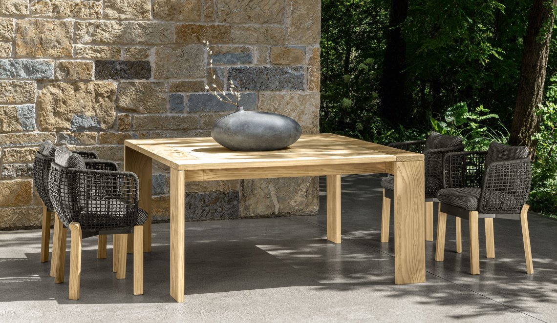 L’avvolgente volume intrecciato della Poltrona da Pranzo abbraccia la cuscinatura accogliente ed abbondante, creando un gioco di forme e di consistenze che completa e rifinisce il gusto della collezione Argo. L’impiego delle corde sintetiche intrecciate per la struttura dello schienale e per i braccioli, l’imbottito sfoderabile e realizzato in quick dry foam rendono la Poltrona da Pranzo pratica e resistente agli agenti atmosferici. Il pregio dell’intreccio, associato alla texture ricercata dei tessuti fanno di questa seggiola l’elemento perfetto per impreziosire qualsiasi spazio outdoor.