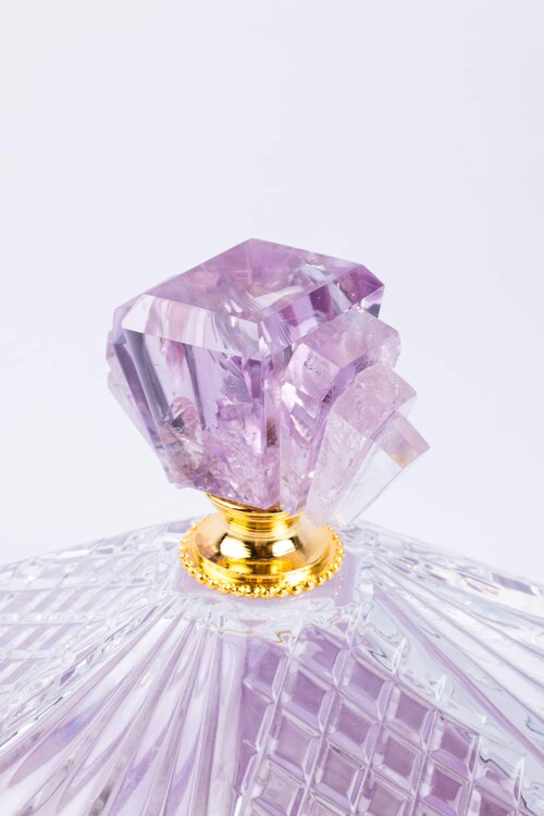 The diamond’s brightness of the french cut crystal exalts the deep color and grain of the quartz. A jewel detail that embellishes this hexagonal shaped amethyst casket box in a perfectly Art Decò style and yet with a contemporary design. Each piece is hand-cut and therefore unique. Available in three sizes.