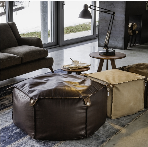 The 456 Four.six ottomans inspire a creative and dinamic use of interior spaces. The ottomans are covered with fabric or leather and have a square, pentagonal or exagonal shape and they can be easily fastened to each other through leather buttonholes and wooden buttons. The possibility to attach and combine ottomans with different colours provides multi-coloured and multi-sized combinations, with numerous covering materials.