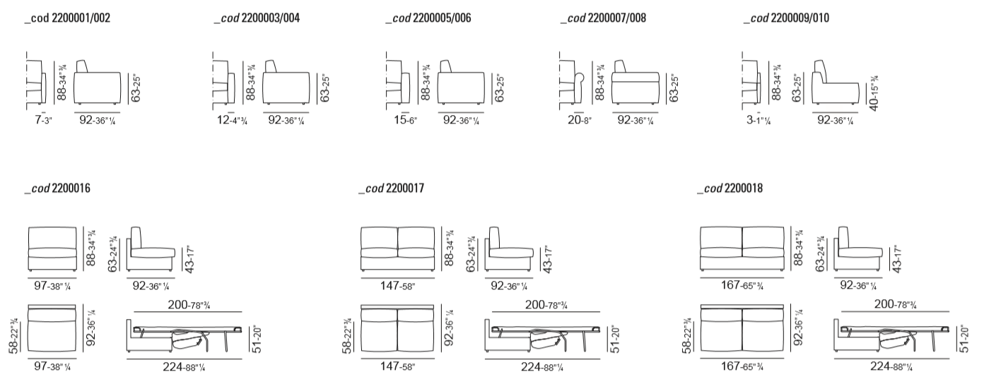 The main features of 2200 Squadroletto are the two variants as sofa and sofa bed, the versatile design which allows a corner sofa bed to be combined with various corner and end elements. You can choose from four different types of arms or even choose the variant without arms.