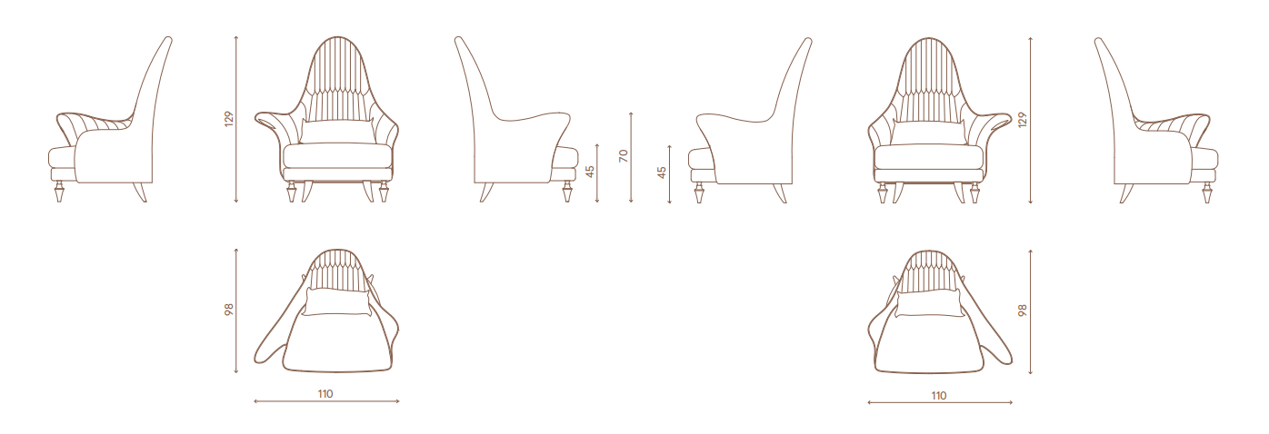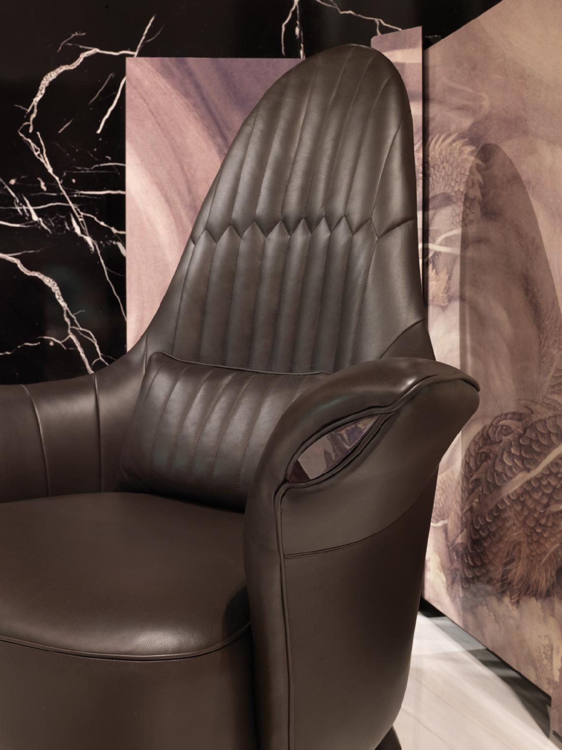 Structure in plywood and in solid wood, polyurethane foam in different  densities Memory Foam? and acrylic fifibre padding, backrest upholstery  with capitonné rhombus pattern and seat cushion with light quilting. Back  cushion in goose down, front feet in turned aluminium in chromed/golden/ bronzed fifinishing and rear feet covered with fabric or leather. Option:  decorative insert in the armrest in semi-precious stone or briar wood/veneer