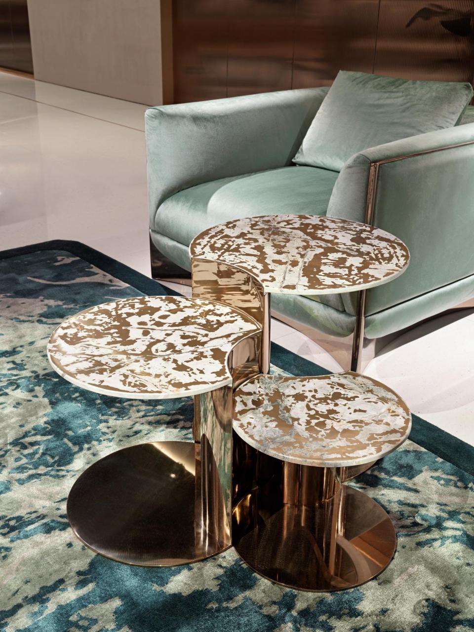 Set of three tables in different heights, with structure in stainless steel combining concave and convex surfaces. Bevelled and shaped top in marble. Tables of this set can be also purchased individually