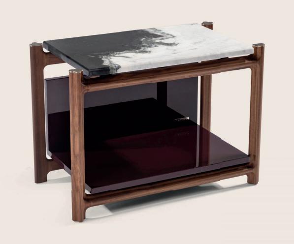 Low table, main structure in main structure in carved Canaletto walnut solid wood, lower shelf in shiny lacquered wood. Top in marble.