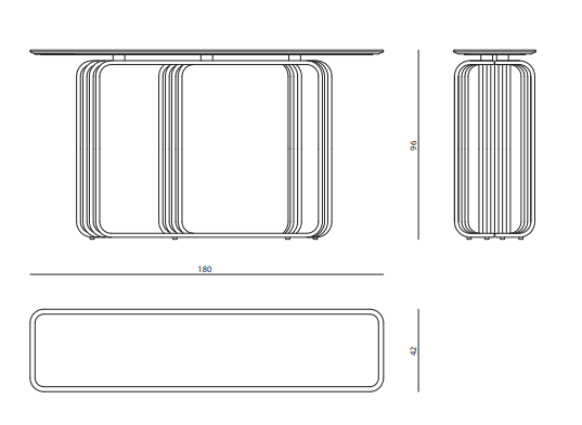 Console with metal tubular structure in chrome finish, suspended top in glass or marble.