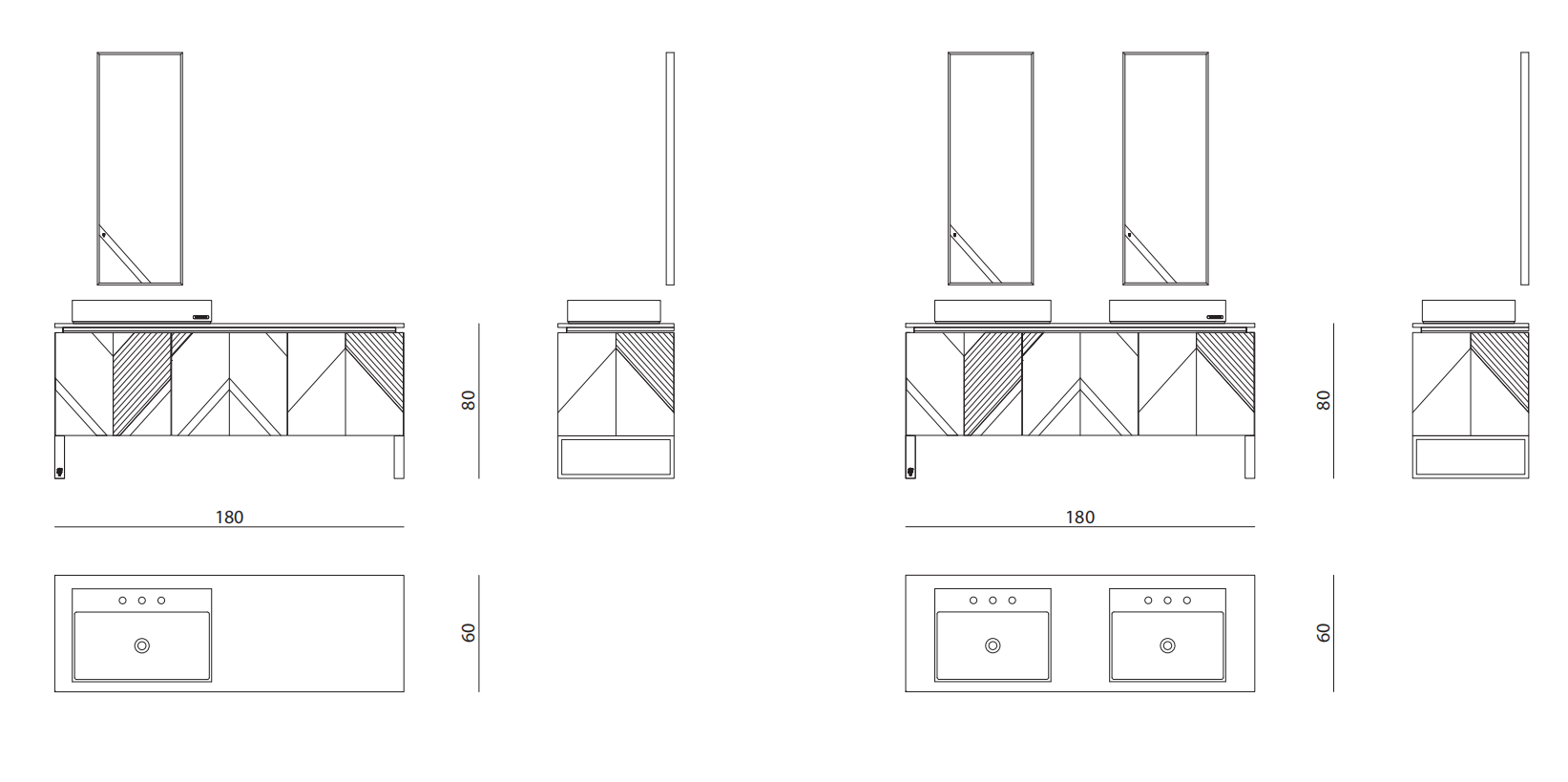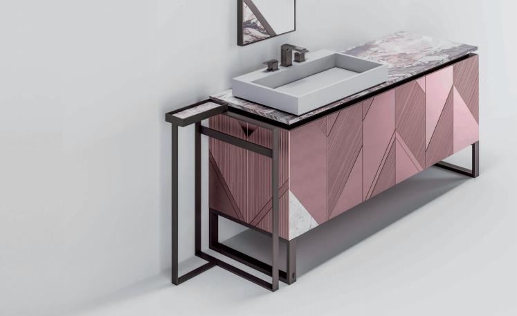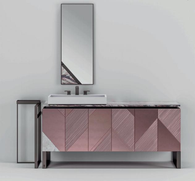 Wash-basin console in lacquered wood decorated with carved geometrical pattern; top in marble with basin in Corian? and taps in steel and marble. Decorative inserts in steel and marble. Structure in marine plywood with basket drawers and sides in steel/glass with soft-closure slides. Internal drawers in matt lacquered wood. Feet in satin stainless steel. Mirror with insert in marble and satin stainless steel with engraved Visionnaire logo, external profiles in satin stainless steel. Available also with two basins.
