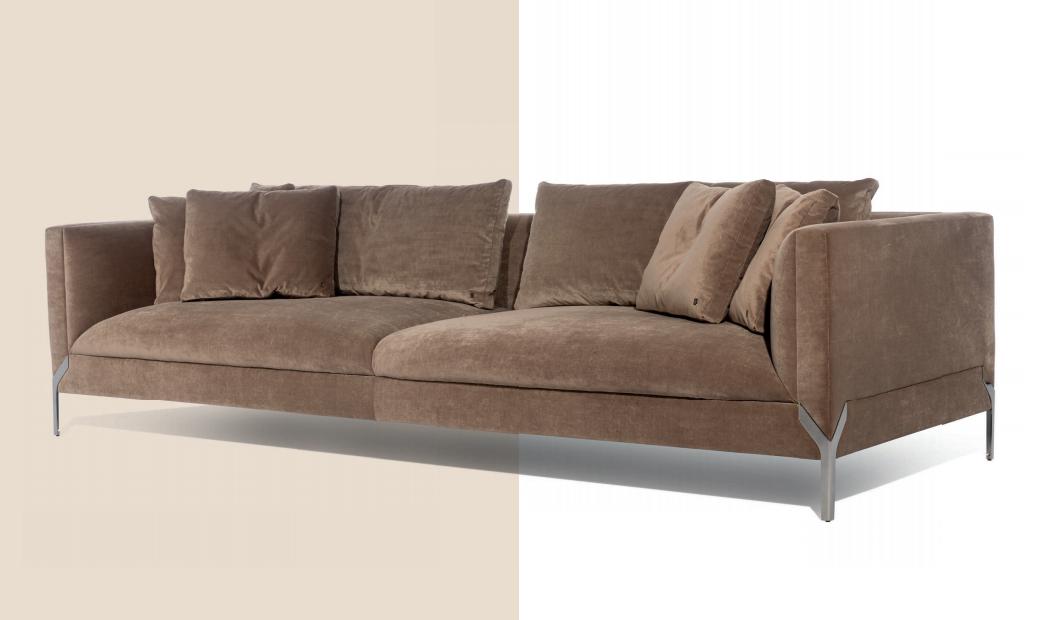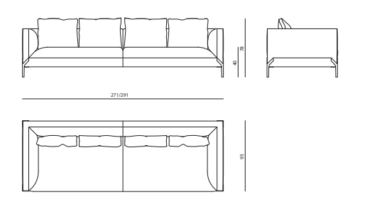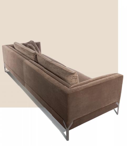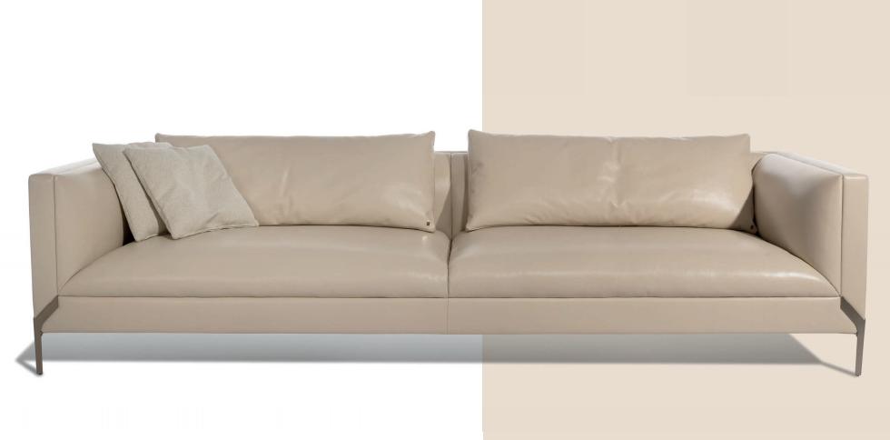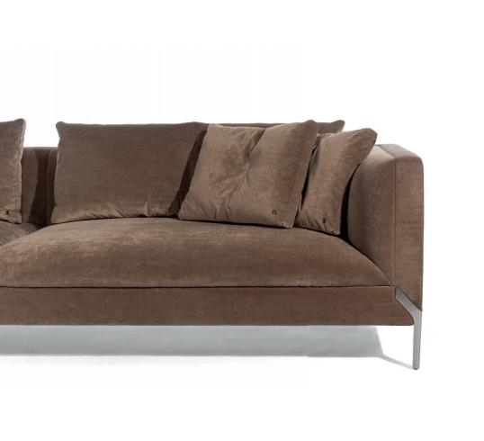 Sofa with non-removable upholstery in leather or fabric, structure in plywood and solid wood with elastic webbing stretch bands, padding in multi-density polyurethane foam, Memory Foam? and feather. Loose cushions in feather. Dove-tail feet in stainless steel.