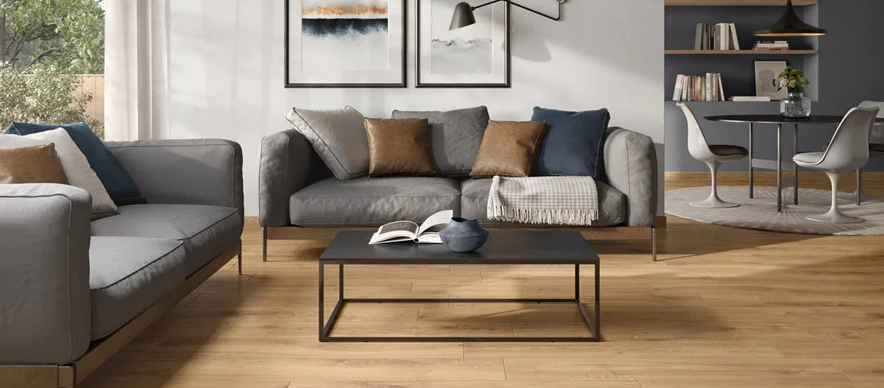 OAK SIDE’s design is reminiscent of fine oak. The matt porcelain stoneware tiles feature the easy-care VilbostonePlus finish and are available in four shades of brown ranging from light to dark and in the two formats 30 x 120 cm and 20 x 120 cm which are commonly used for floor boarding.