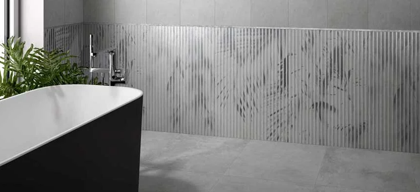 Familiar yet mysterious, clear and yet a bit surprising – OMBRA wall tiles play with the illusions of light and shadow. The elegant range combines two looks in a single design with a glamorous touch: fine stripes and a graphic-floral pattern that appears stronger or weaker depending on lighting and the viewing angle.