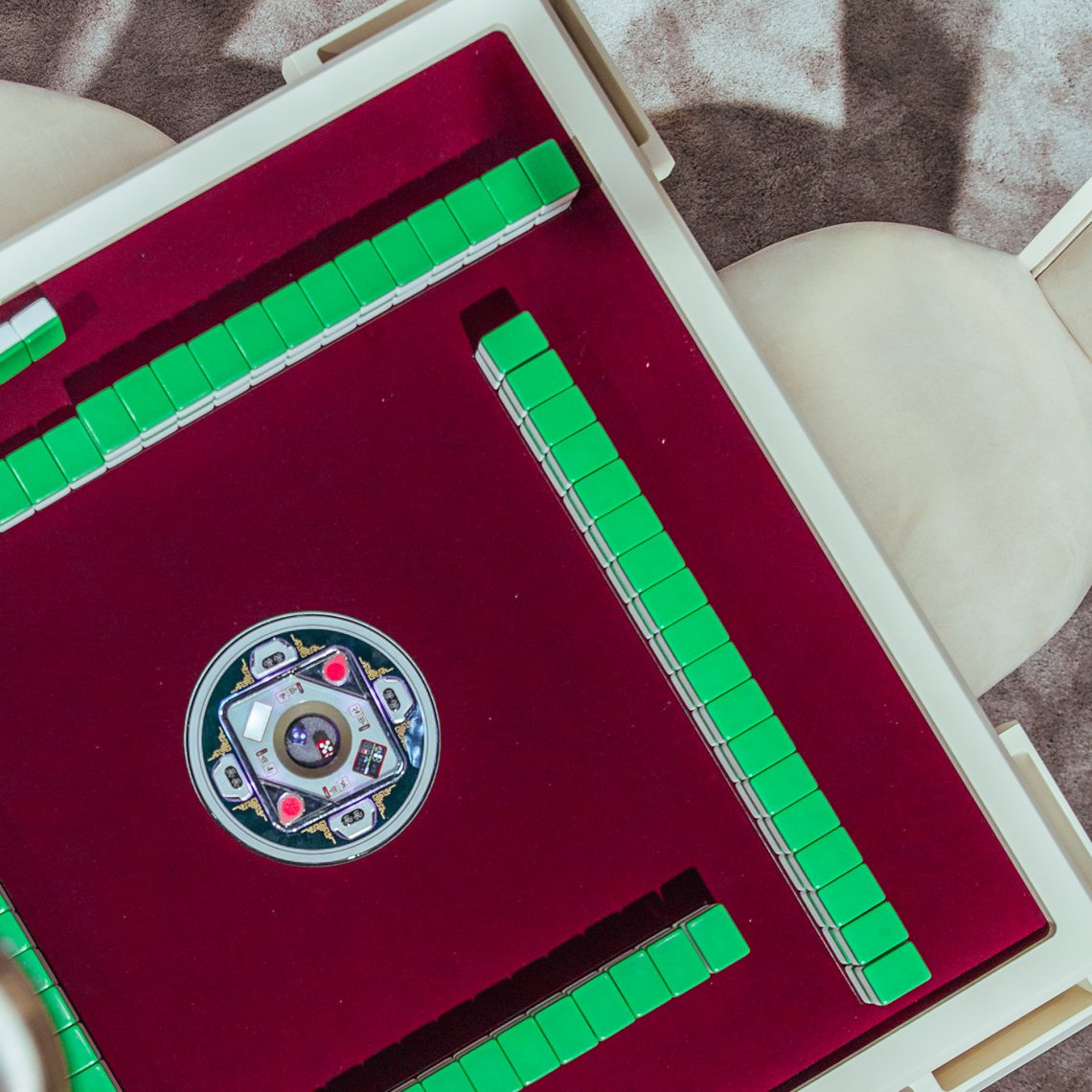 Aesthetically, the combination of an original look and a modern style, is associated to traditional layout of the game red velvet surface, making this design piece a real artisan masterpiece. A table complete with functional pockets and USB ports, placed in player positions, with two professional Mahjong tiles sets. It has a lacquered matt ivory and dark brown structure with 24kt details