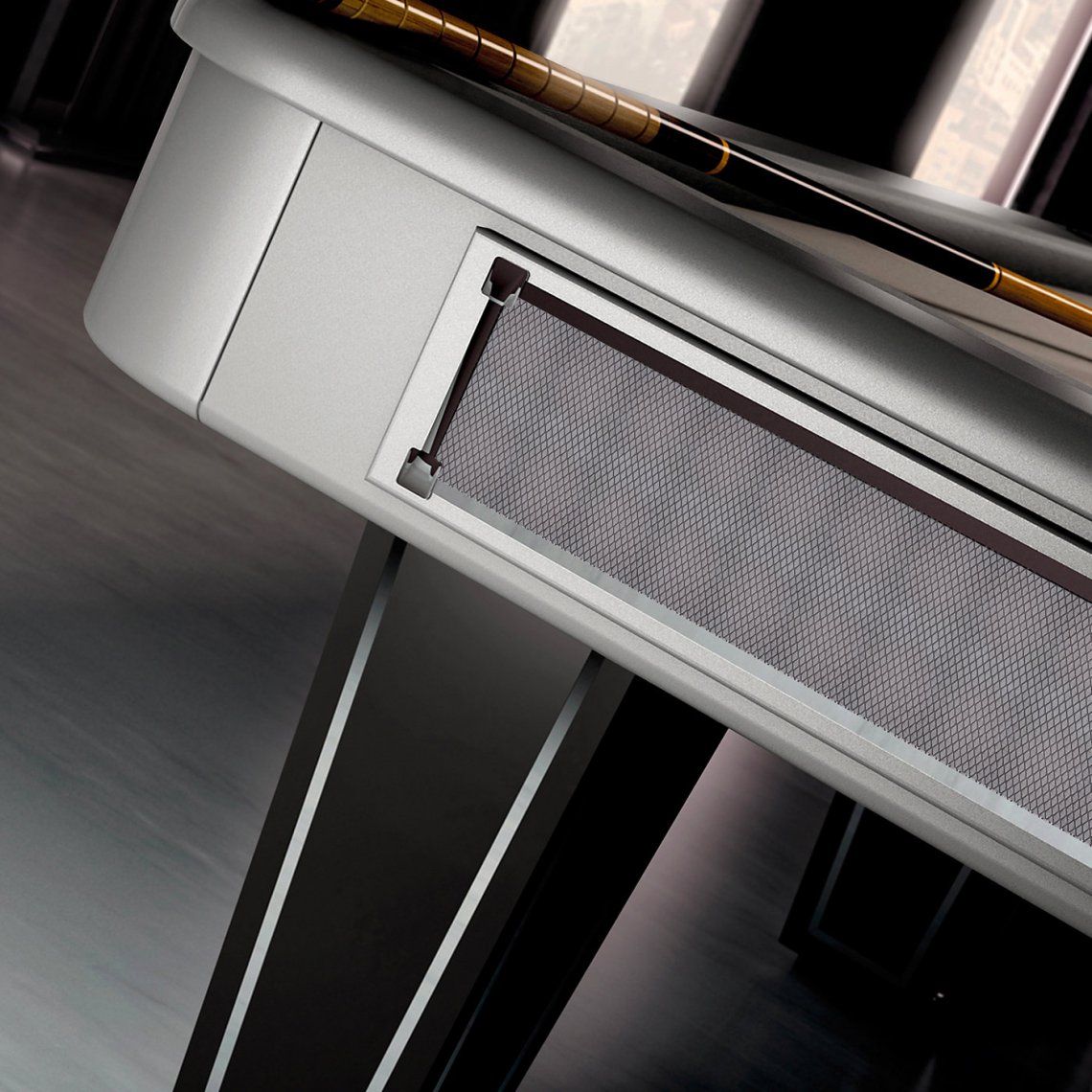 Add futuristic appeal to your game room with the Alu pool table. Crafted in solid wood and varnished in metallic silver and glossy black, the table is topped with a solid slate playing surface and gray fabric from industry leader Simonis. The table is then accented with leather pockets and polish steel profiles for a luxurious touch.