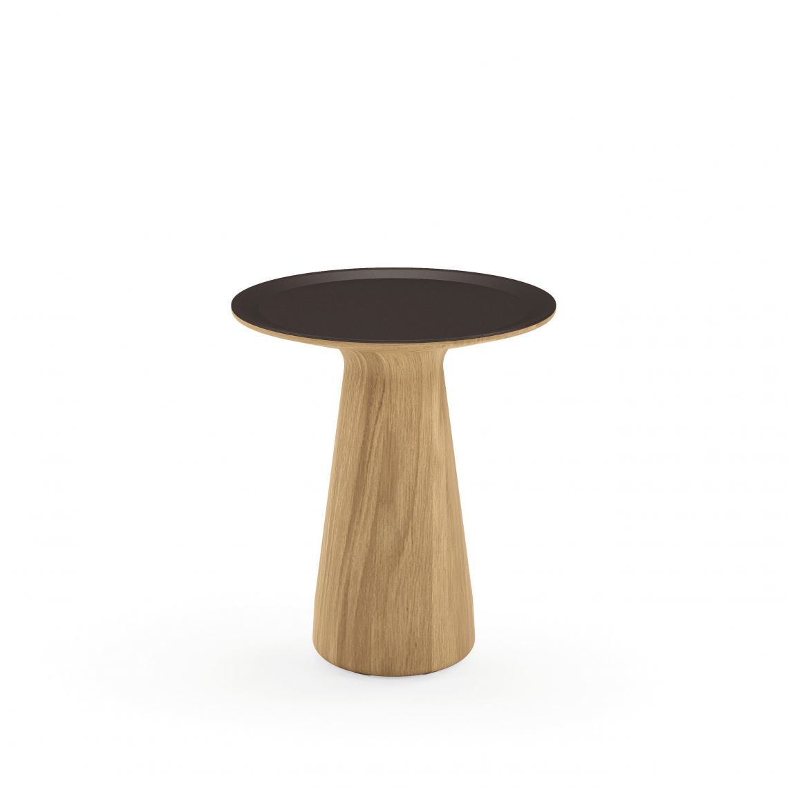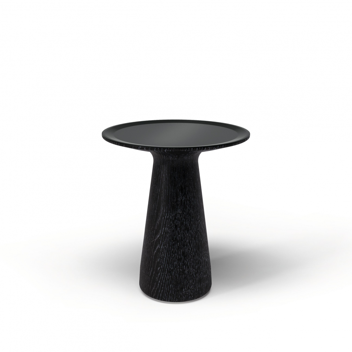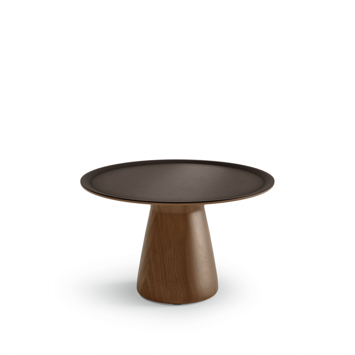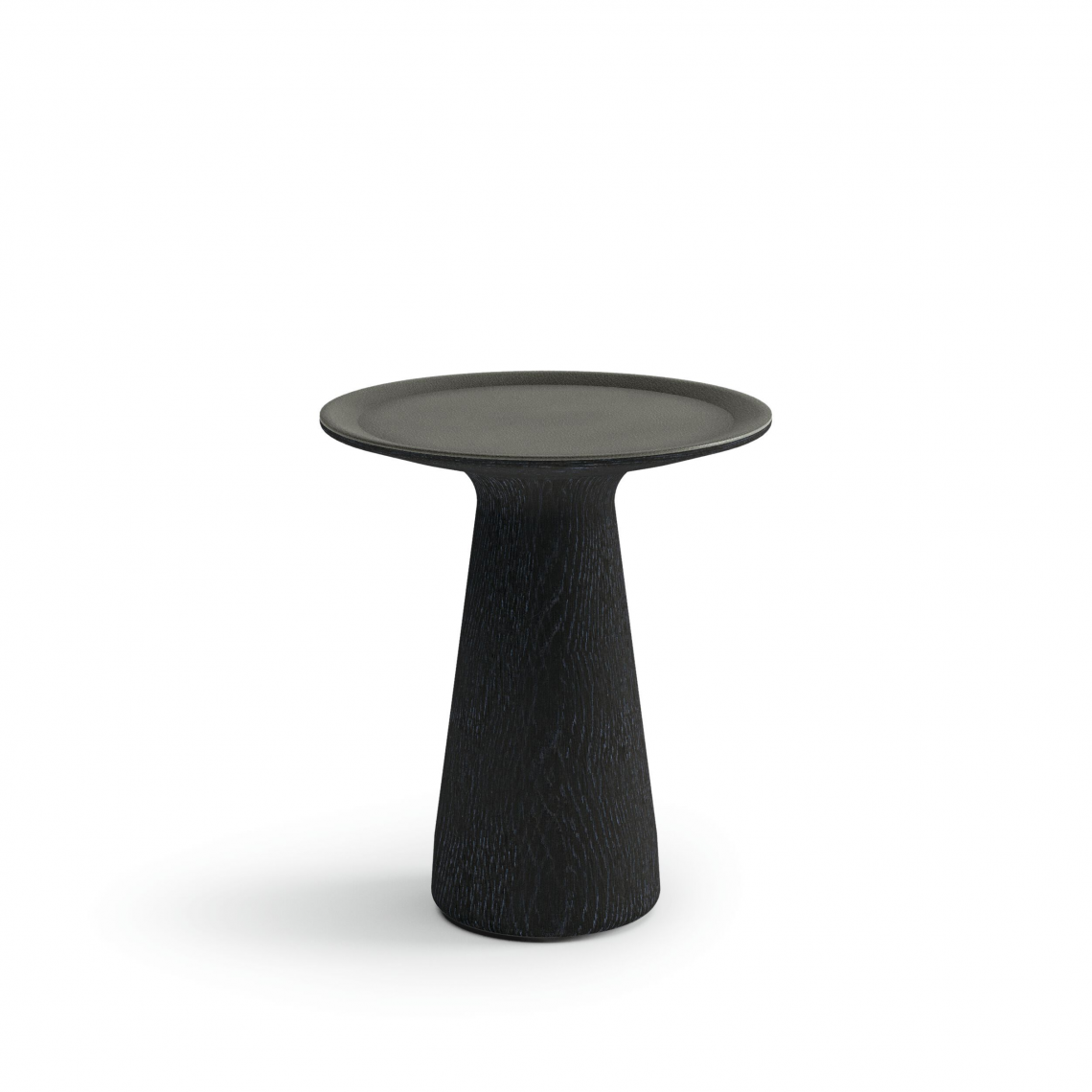 A small tree in the room – this occasional table appears to be rooted to the floor. Its richly grained solid walnut or oak stem tapers to support the streamlined table top with assured elegance. Available in black, bronze, or with an elegant leather covering.