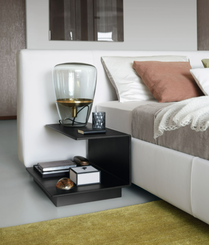 Nighttime storage for book and personal items near the bed. Functional and elegant, the swivel box guards personal treasures you like to keep hidden. This side table completes the comprehensive Yuuto sleep system comprising bed, banquette, and console.