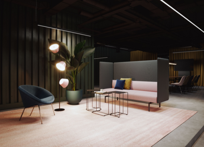 The screens of the Muud Silent Sofa make it possible to create a space in a large room where you can have confidential conversations and work on something together. A sustainable and economical solution – reduced in material and volume.
