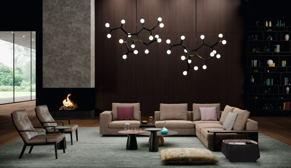 The lounge chair works in an exceptionally soft and intimate way: inviting upholstery, soft leather with stitched piping, elegant and inwardly contoured wood. Available with high or low back and an accompanying stool.