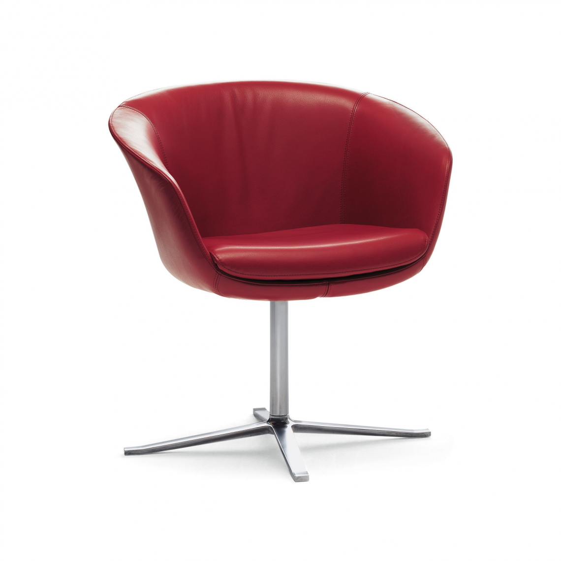 An elegant dining chair with the comfort of a padded armchair. The shell shape, with gently curved armrests, supportive back, and inviting seat cushion, rests on a streamlined column. The chair is easy to swivel on its elegant star base. Perfectly combined with our X-Table in various sizes with matching pedestal.
