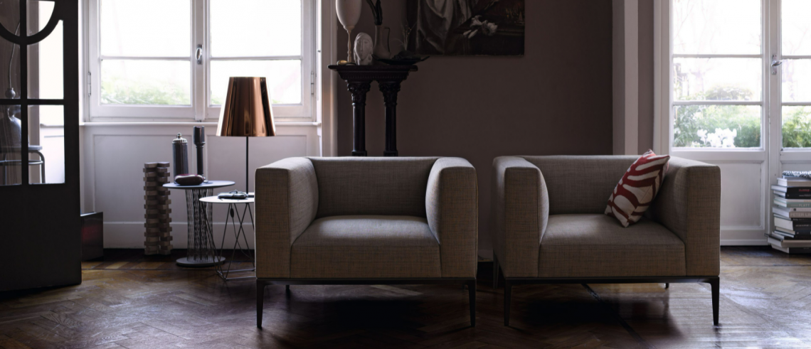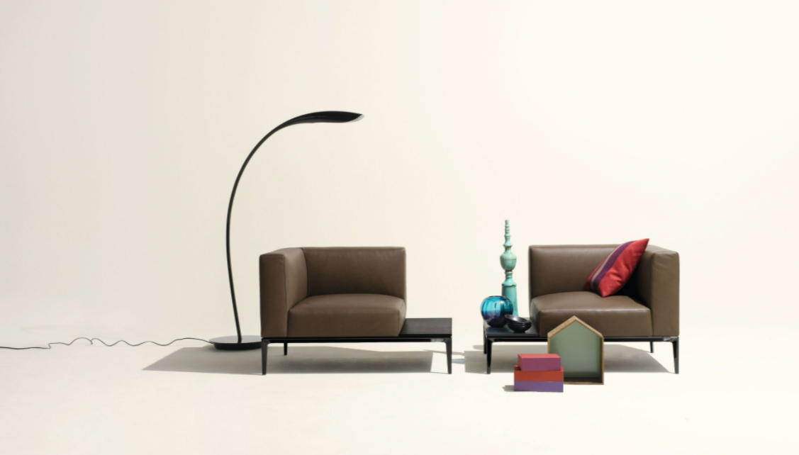The compact spatial dimensions of the solidly upholstered chair are poised on delicate feet. The fine felled seams are a sign of expert craftsmanship. The chair-chaise longue can be fitted with side shelves. Excellent design for two worlds: private and public.