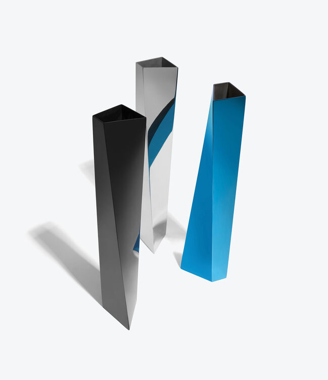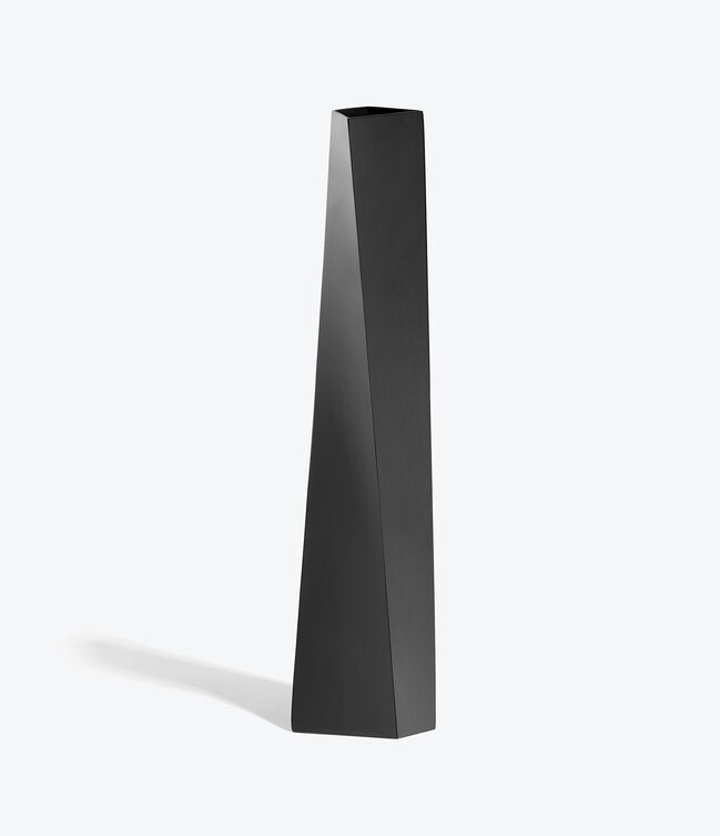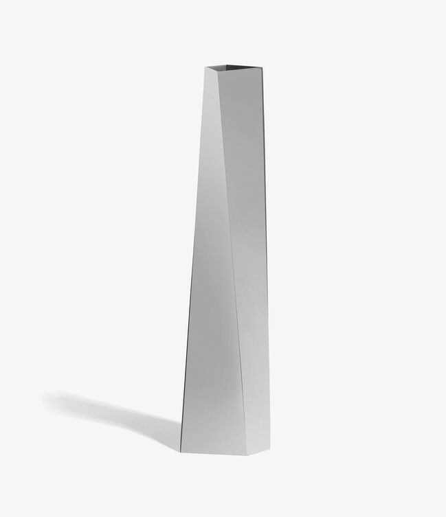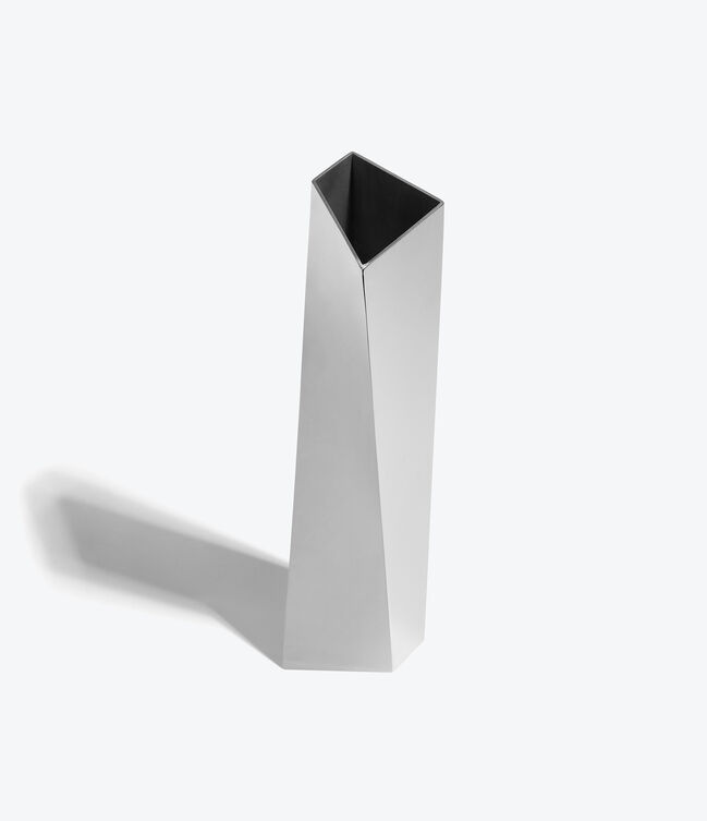 CREVASSE Vase - polished stainless-steel vase that twists vertically to an irregular quadrilateral opening – a Zaha Hadid x Alessi collaboration.