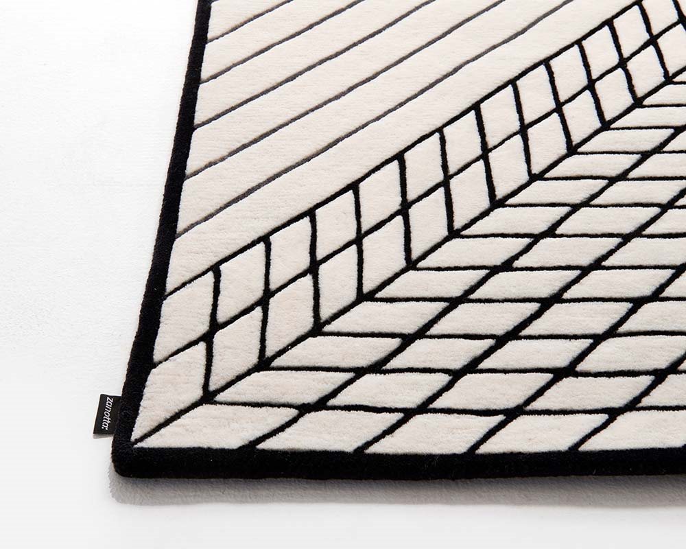 手制簇絨地毯,整個表面具有均勻絨毛,由 100% 新西蘭羊毛制成。地毯底層材料采用100%棉質(zhì)帆布制成,以 100% 天然乳膠固定。四周邊緣為純手工編織,六邊均采用羊毛紗線織就。具有為 200x300 和 250x350厘米版本可供選擇,均為統(tǒng)一顏色:底部為白色,點(diǎn)綴與原始設(shè)計(jì)呼應(yīng)的灰色與黑色線條。地毯的整體厚度約為 9 毫米,重量為 3.7 公斤/平方米。