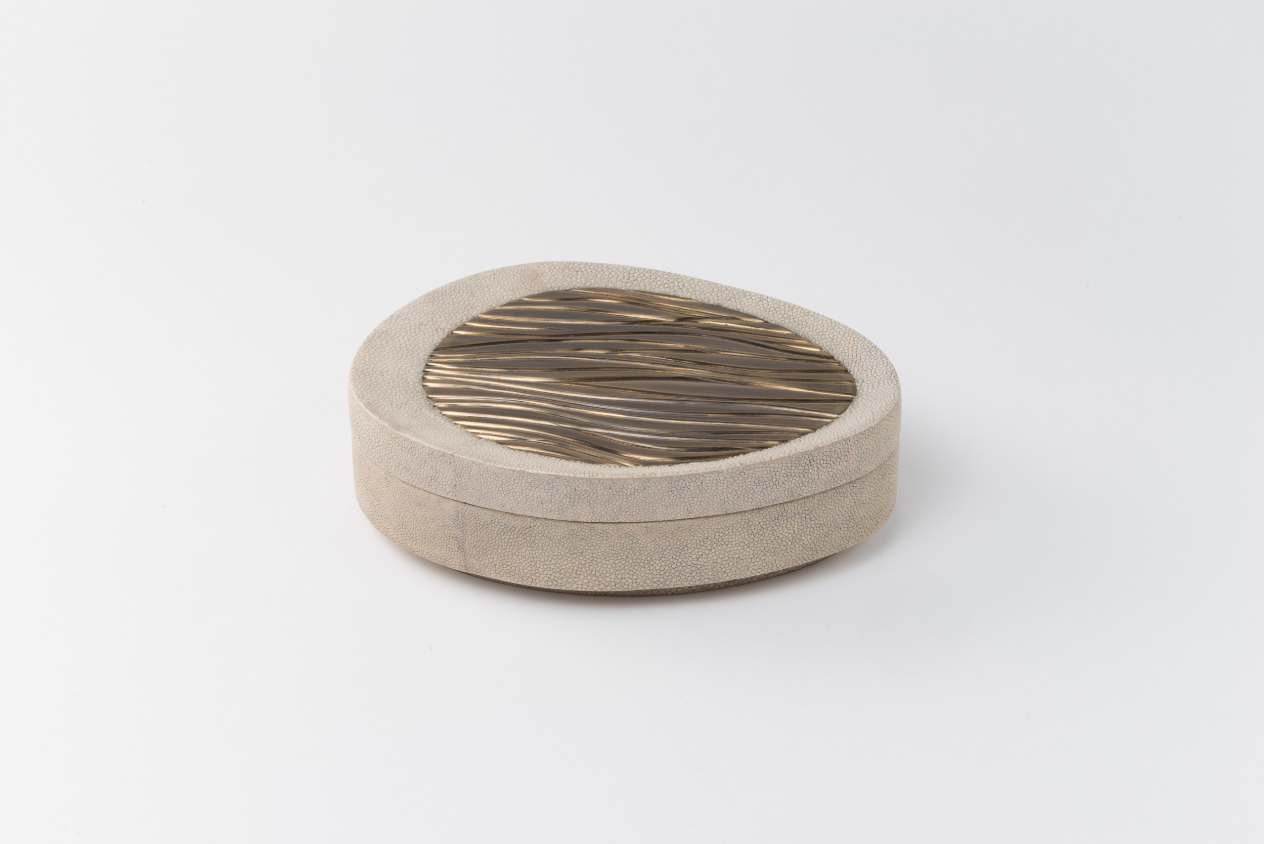 With her soft lines and intricate bronze-patina brass inlay, the Pendant Box S is a beautiful accent for all interiors. This item is available in other finishes and a medium size.