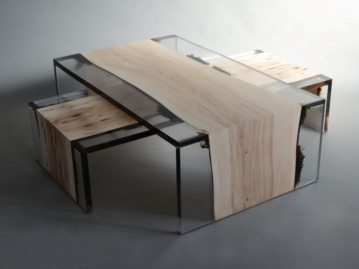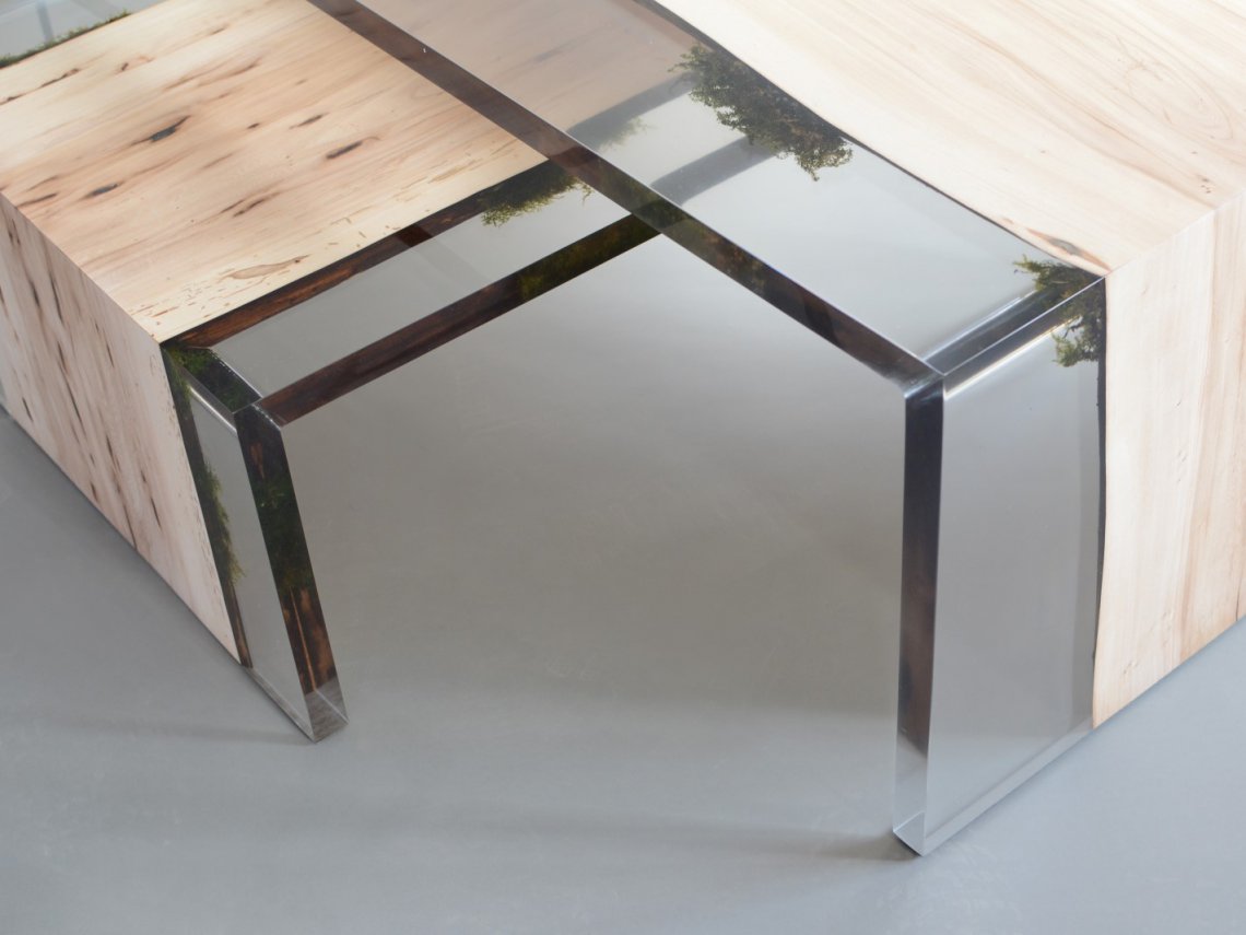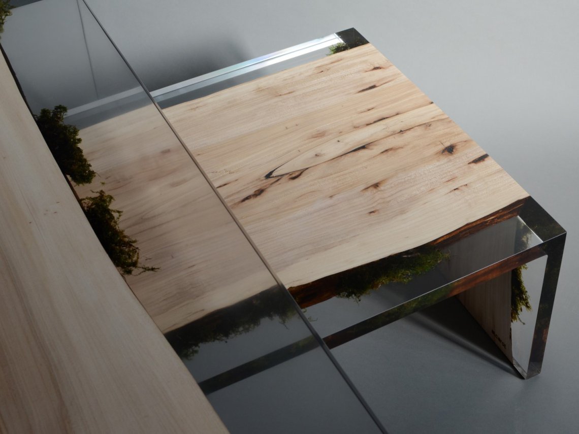 alcarol recovered some logs from the undergrowth of the Italian Dolomite mountains and cut planks that preserve the natural edges with their native populations of mosses, which are embedded in a resin resembling the water that generated their life.