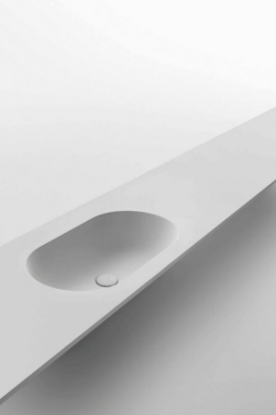 Mobile bagno porta lavabo con cassetto, top integrato e lavabo da appoggio, dimensioni da 140cm a 160cm. Piano integrato in Fenix con taglio a 45°. Lavabo in Cristalplant? Bio Active opaco modello Ciotola con copri piletta in Cristalplant? Bio Active, disponibile nelle versioni centrato, a destra e a sinistra del mobile. Basi del mobile con frontali e fianchi a 45°. I cassetti sono completamente estraibili e sono disponibili con maniglie opzionali a gola o premi apri.