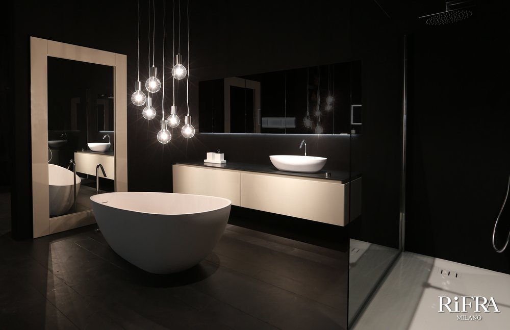 Finitura mobili isola e quinte: cemento nero spatolato a mano.