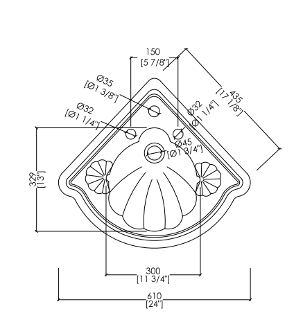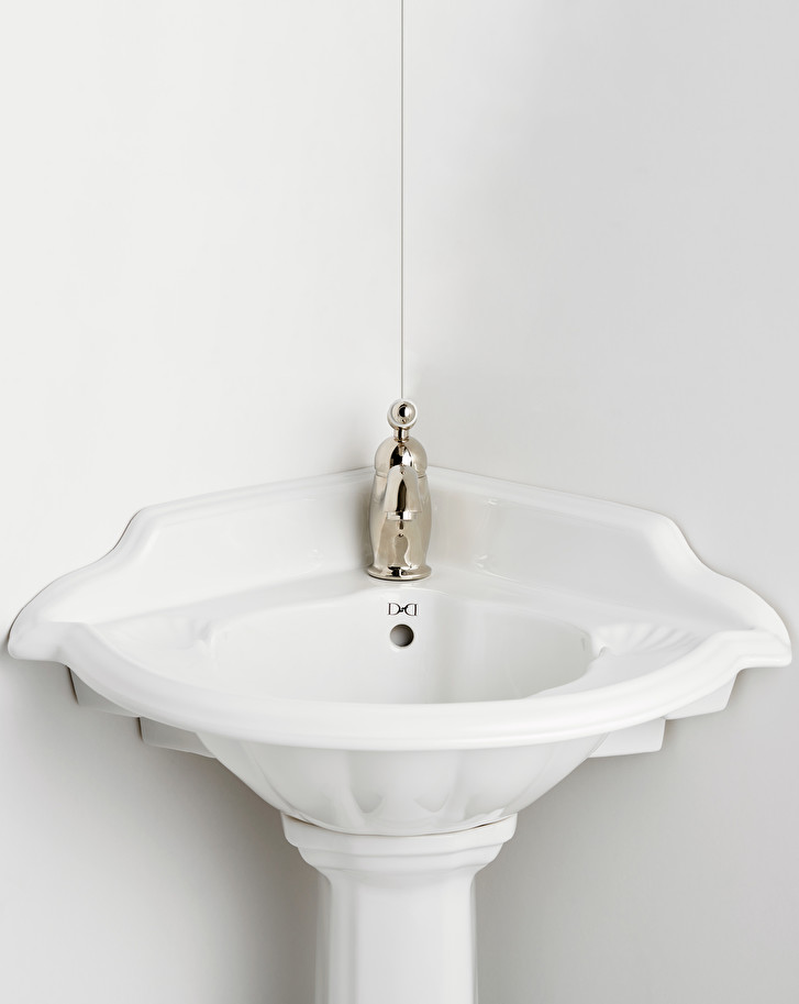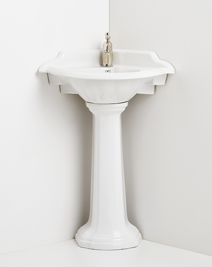 A corner washbasin in fine white porcelain, available with 1, 2 or 3 holes. With a distinctly classic taste, it is characterized by soft sinuosity and decorations that recall the organic shapes of a shell.