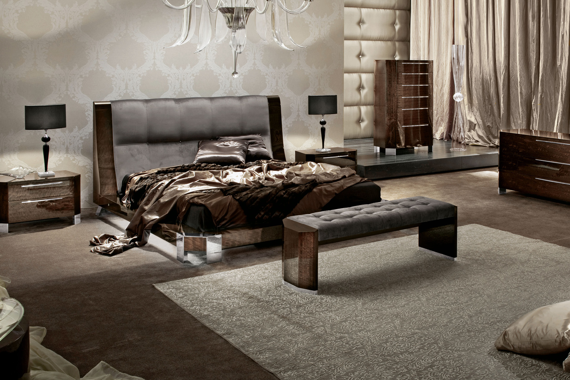 Bench in european curly eucalyptus veneer in high gloss polyester with buttoned seat in first grade leather, velvet or suede fabric. Chrome stainless steel feet.
