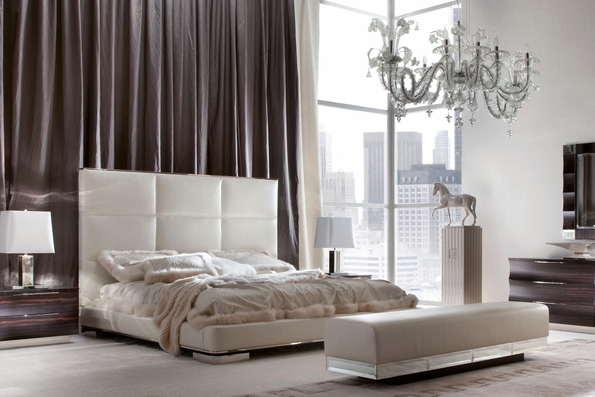 Bench available in first grade leather, nubuk leather, lizard printed leather, velvet or suede fabric. Base in beveled glasses.