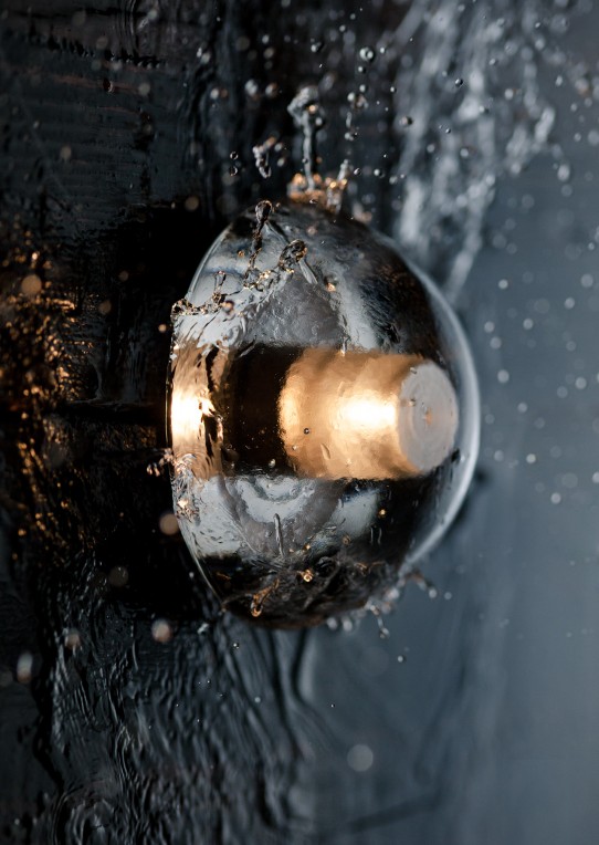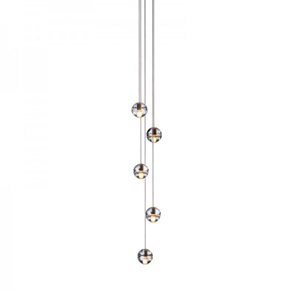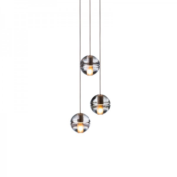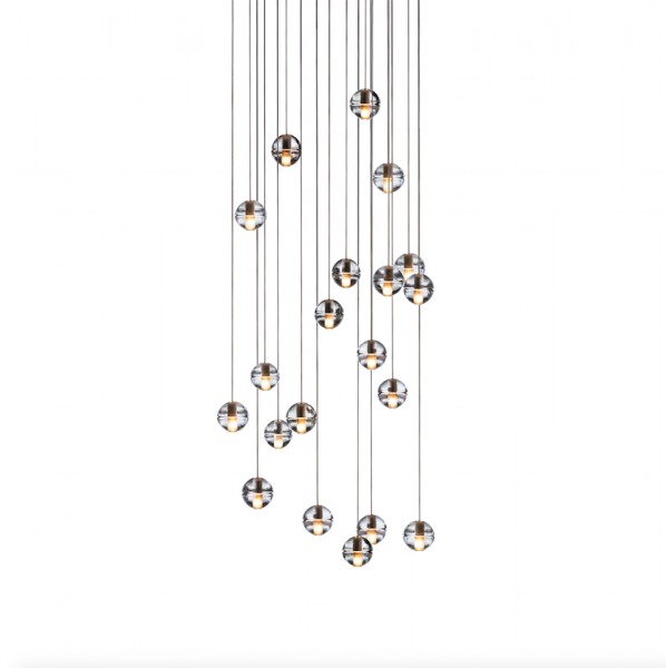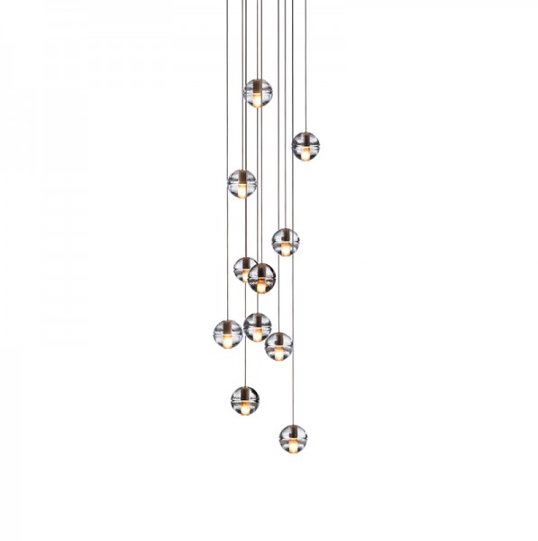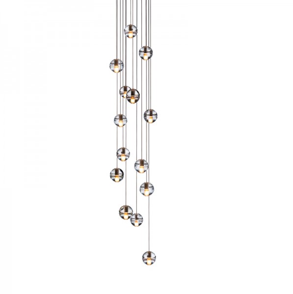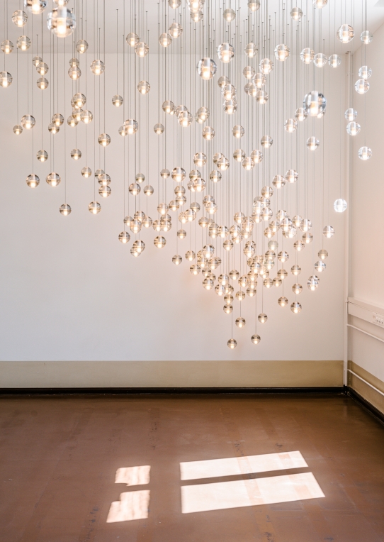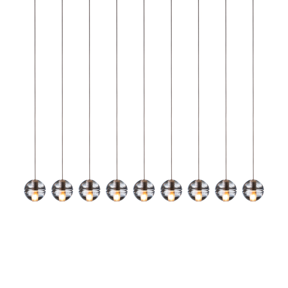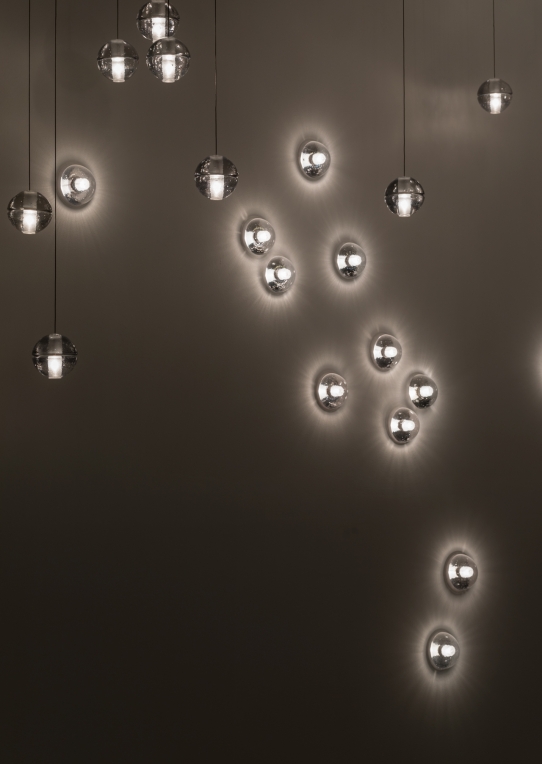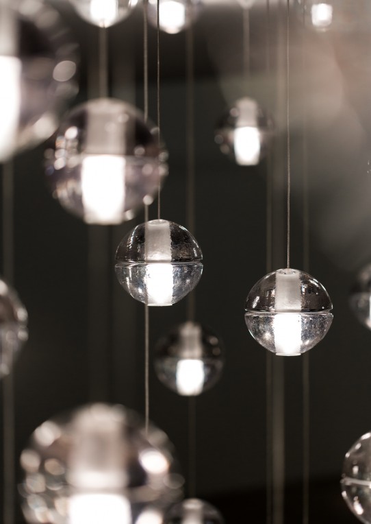 14 is an articulated, cast glass sphere with a frosted cylindrical void that houses either a low-voltage xenon or LED lamp. Individual pendants are visually subtle, but gain an atmospheric quality when multiplied and clustered in groups.