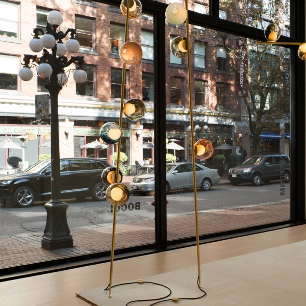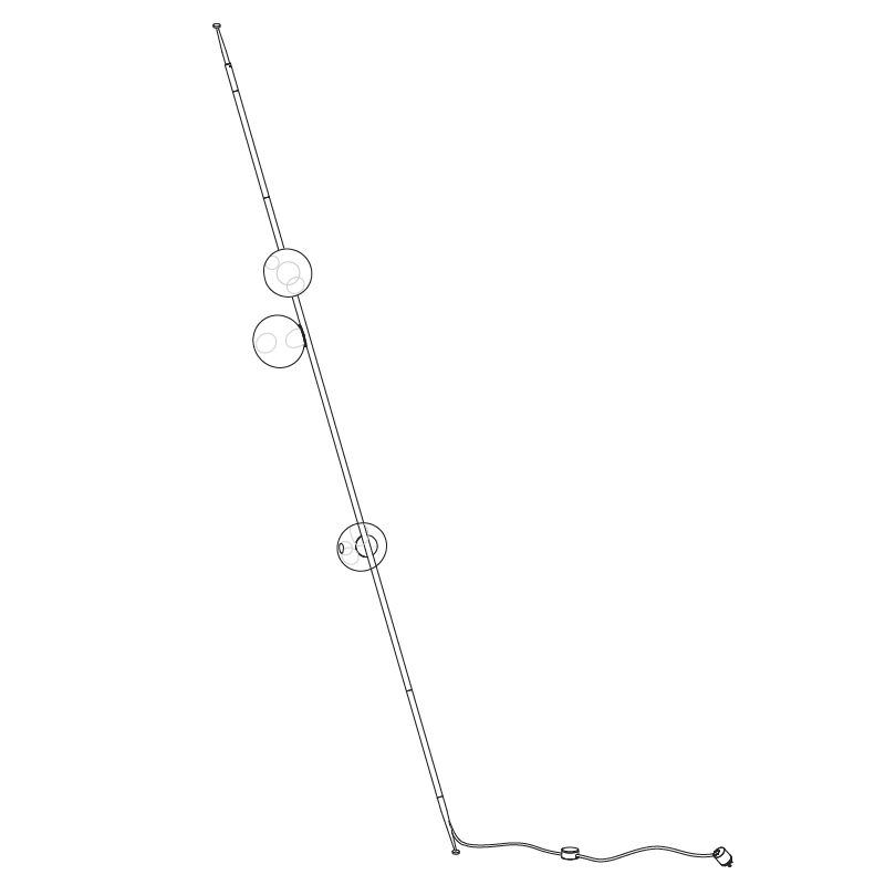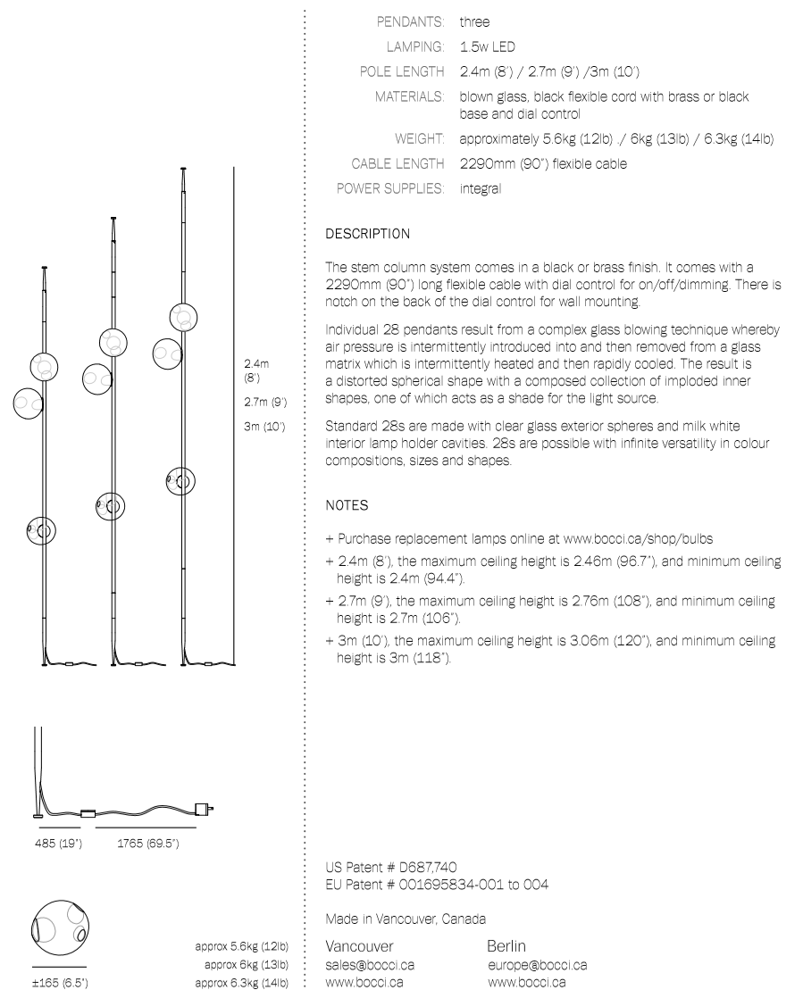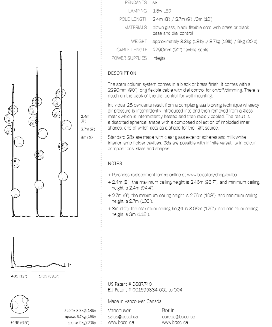 The 28 series stem column system comes in a brass or black finish, two different configurations and multiple height options. The spring loaded spike system allows for both vertical and angled installation. The semi-rigid black fabric cord includes a patented integral 360 degree dimming system housed within a sleek brass cylinder.