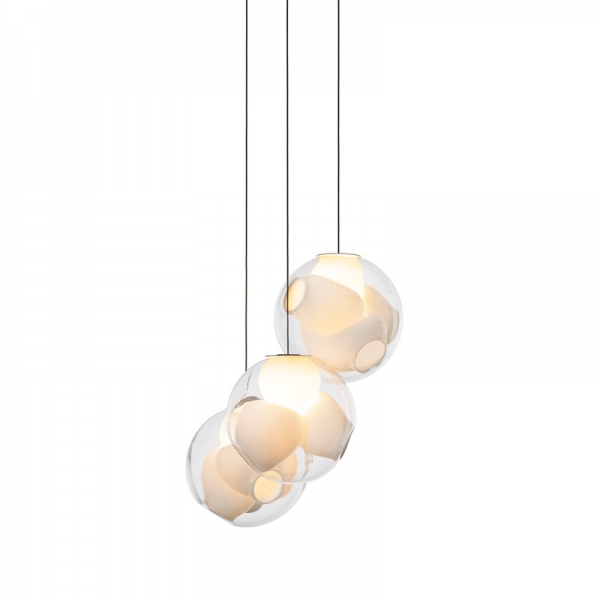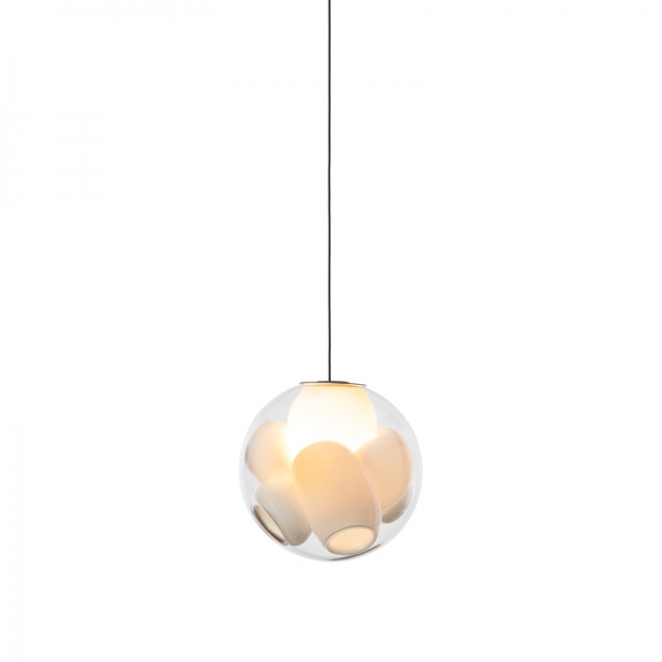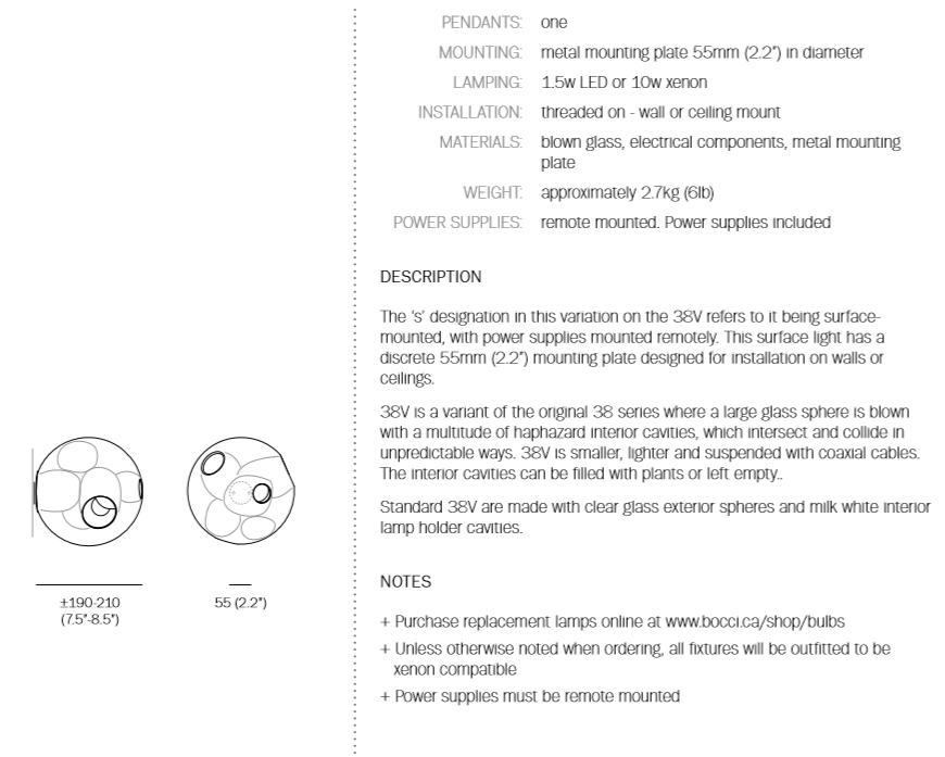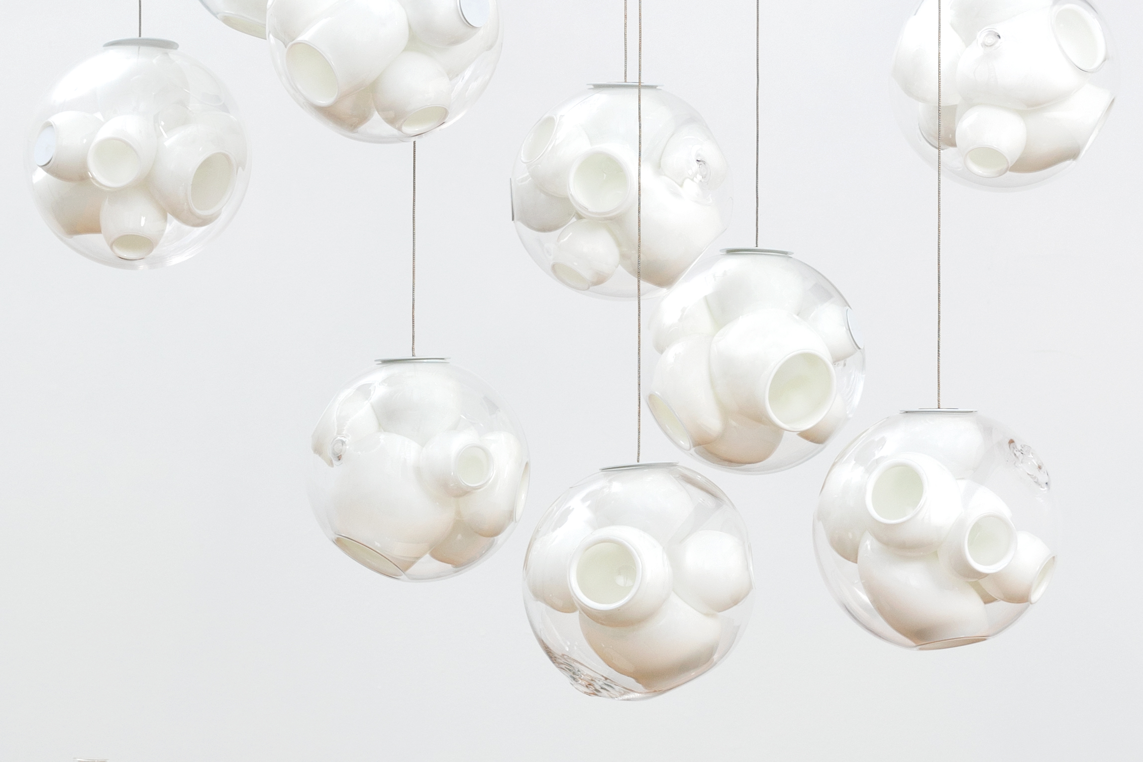 38V is a variant of the original 38 series where a large glass sphere is blown with a multitude of haphazard interior cavities, which intersect and collide in unpredictable ways. 38V is smaller, lighter and suspended with coaxial cables. The interior cavities can be filled with plants or left empty.