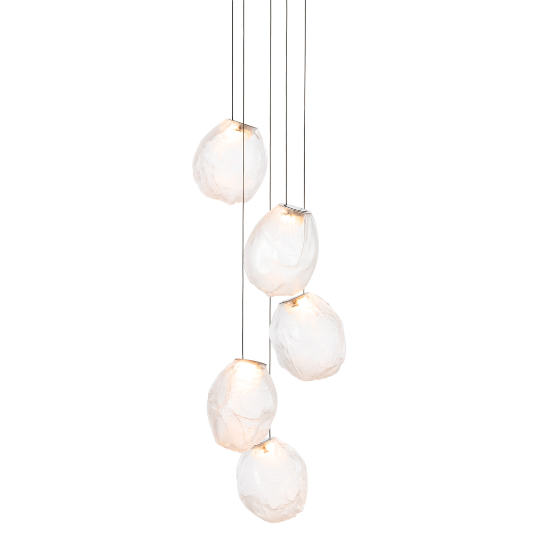 73.5V is a low voltage arrangement of 5 blown-glass pendants. Each pendant is hand blown into a folded and highly heat-resistant ceramic fabric vessel. Each pendant is housed with a 10 watt xenon or 1.5 watt LED lamp.