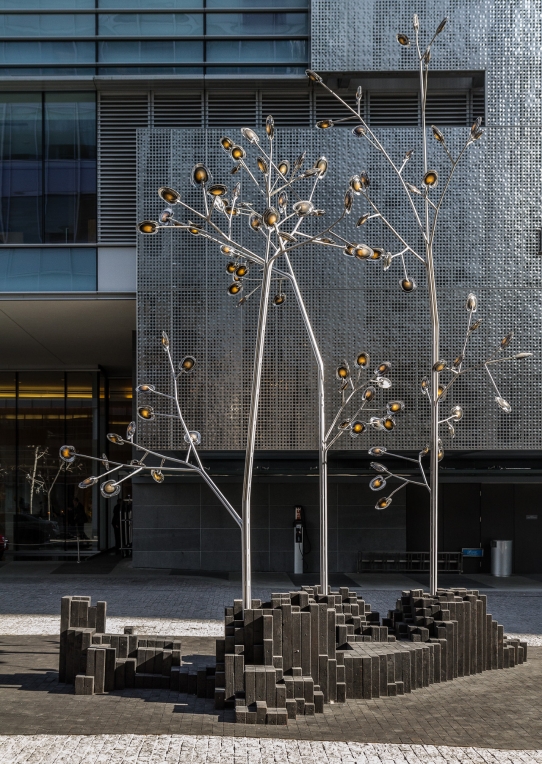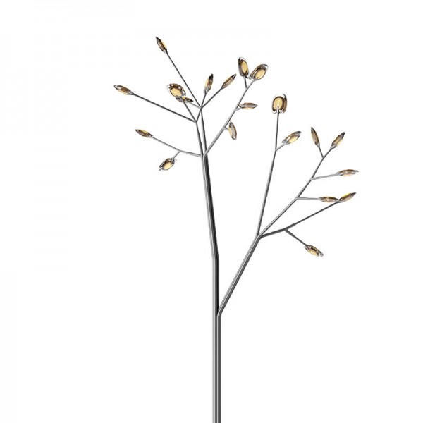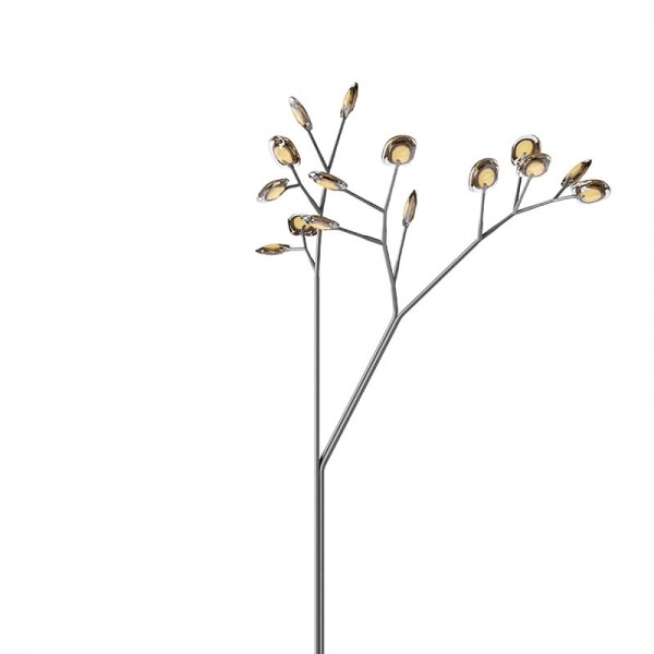A bead blasted steel armature system connects the glass pieces to a series of branches and stems. Each armature segment carries low-voltage electricity and diverges into 2-4 separate branches, allowing an infinite variety of possible forms.
